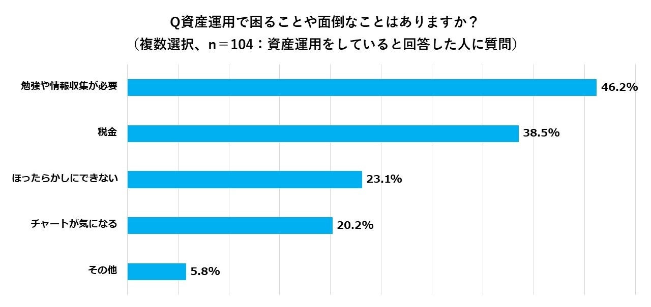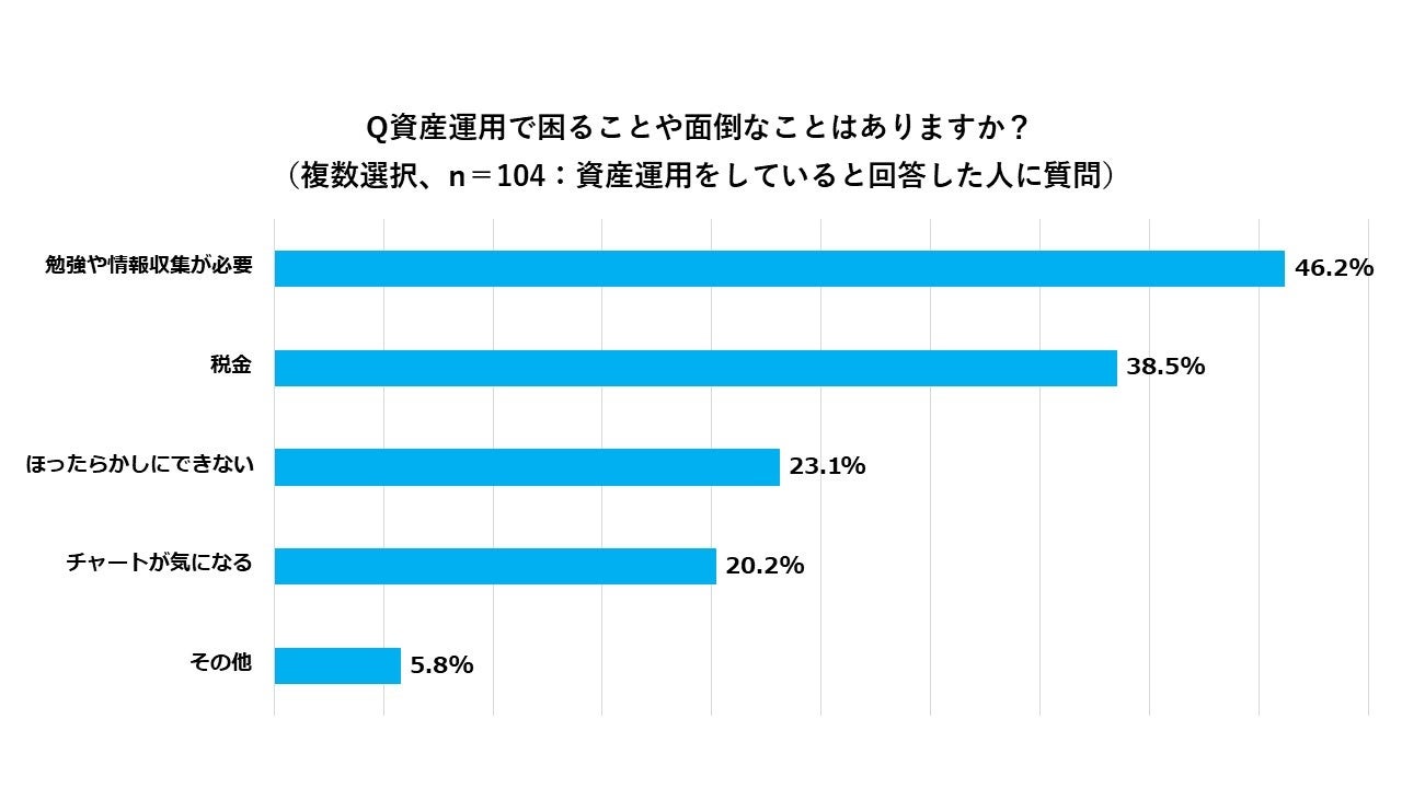 資産運用で困ることや面倒なことは「勉強や情報収集が必要」がトップに。「税金」、「ほったらかしにできない」、「チャートが気になる」といった声もあがりました。