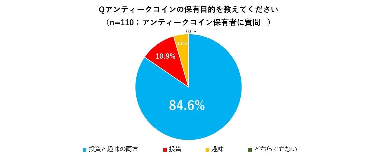 アンティークコインの保有者に、保有目的を尋ねたところ「投資と趣味の両方」が84.6%となりました。