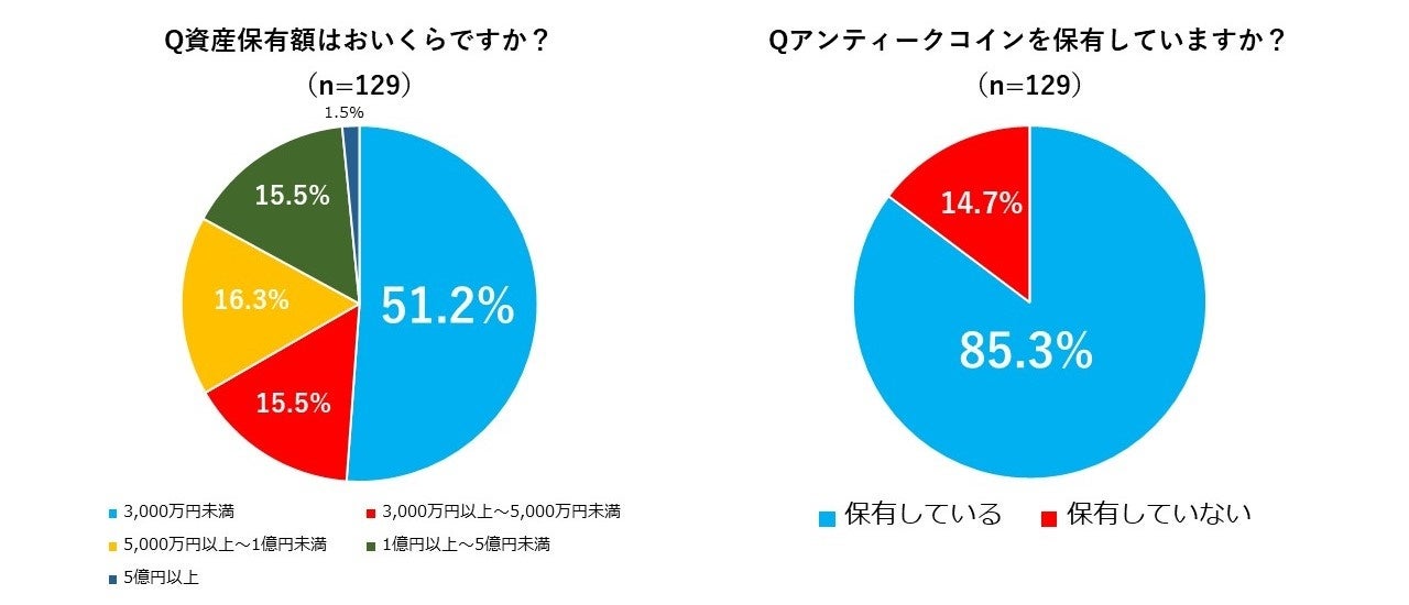 資産保有額は3,000万未満が51.2%、3,000万円以上~5,000万円億円未満が15.5%、5,000万円以上~1億円未満が16.3%、1億円以上~5億円未満が15.5%、5億円以上が1.5%。アンティークコインを保有している人は85.3%に上りました。