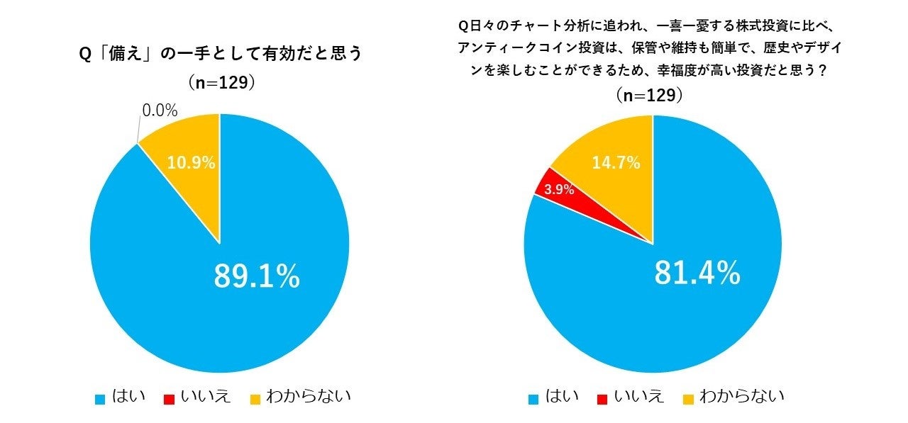 アンティークコインは「備え」の一手として有効だと思うに「はい」と答えた人が89.1%。「日々のチャート分析に追われ、一喜一憂する株式投資に比べ、アンティークコイン投資は、保管や維持も簡単で、歴史やデザインを楽しむことができるため、幸福度が高い投資だと思う」に「はい」と答えた人が81.4%となりました。