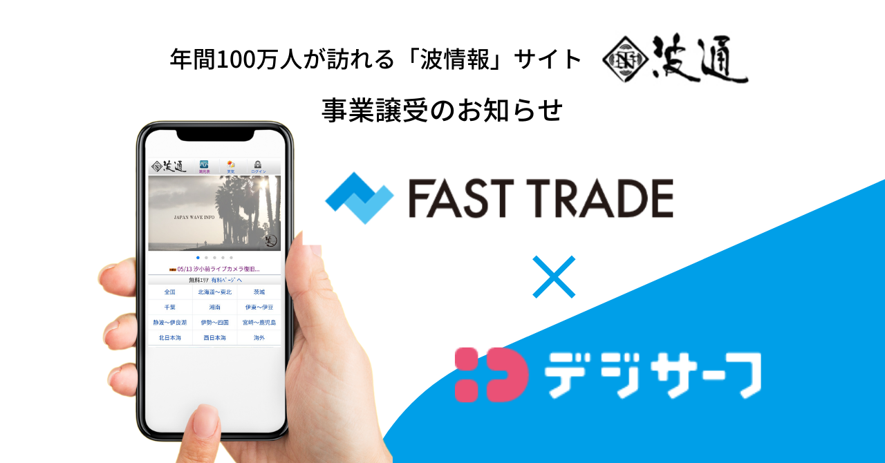 EC事業支援を行うファーストトレード株式会社(本社:福井県あわら市、代表:三上良平、以下 ファーストトレード社)と株式会社デジサーフ(本社:神奈川県藤沢市、代表:高橋佳伸、以下 デジサーフ社)は、デジサーフ社が所有していた波動画情報を配信する「波通」事業に関して事業譲渡契約を締結し、同事業をファーストトレード社が譲受した事をお知らせいたします。
