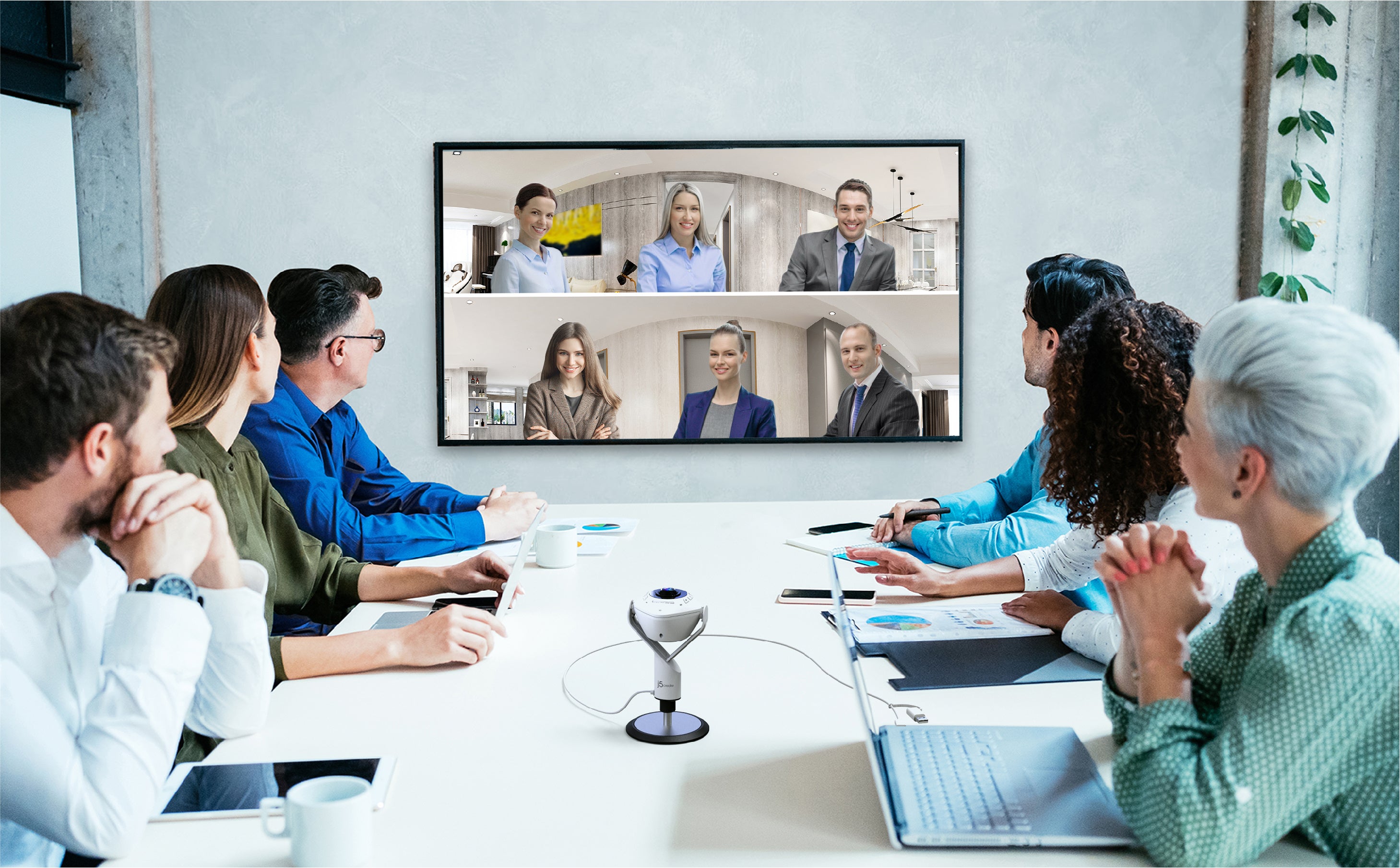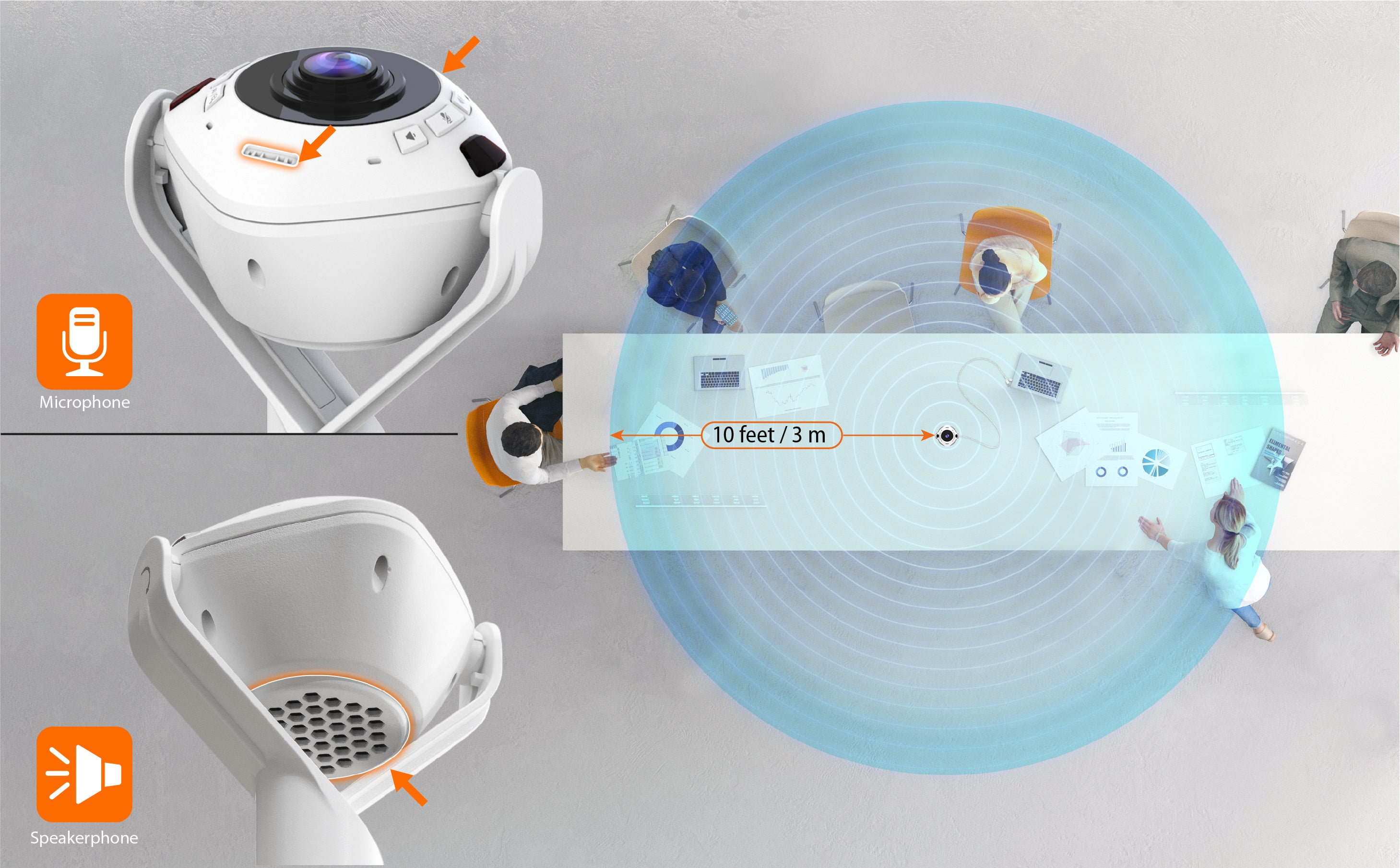 本製品は、魚眼レンズを採用して画角最大化360度網羅できるWebカメラで、さらにAI機能(自動追跡、オートフレーミング)、高音質スピーカーフォンを搭載しています。会議室に本機を一台設置すれば、スムーズにオンライン会議ができる画期的なソリューション商品です。