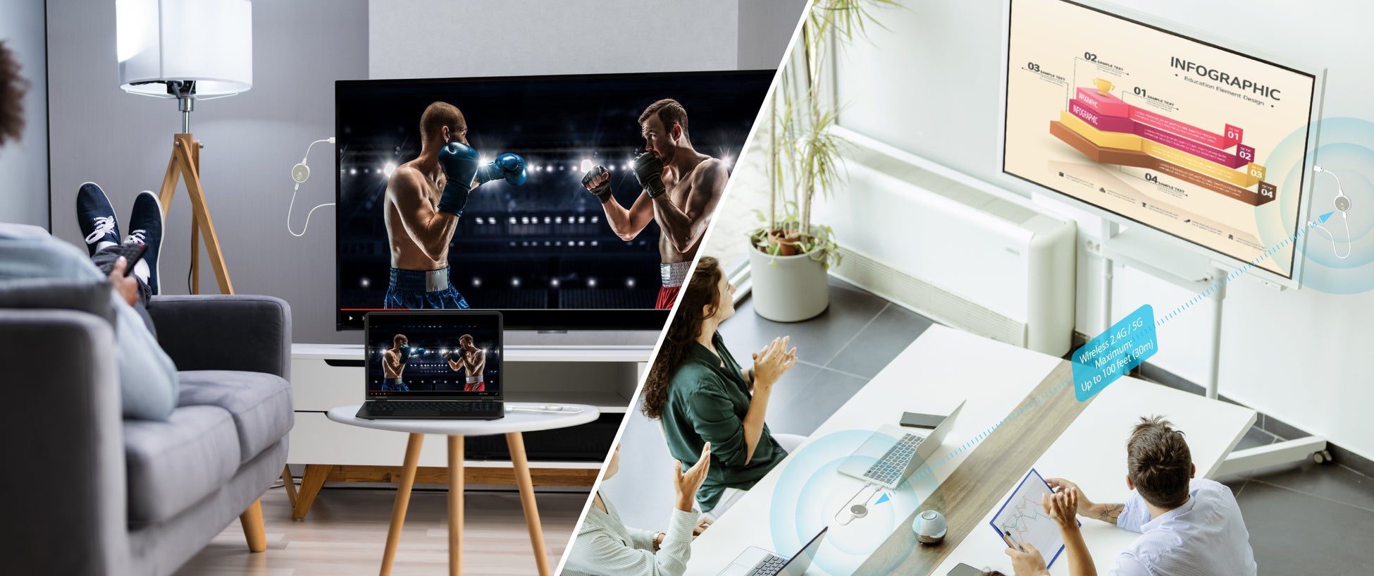 本製品は、HDMI出力できる「ノートPC」や「ゲーム機」などの画面を小型の送信機を介して、最大30mワイヤレスを対象にHDMIディスプレイにミラーリングできる送受信機です。HDCPに対応しているので、PCで再生している有料コンテンツやゲーム内容が見られるのがポイントです。最大表示解像度は4Kをサポートしており、送受信機はUSBポートに給電される設計で、簡単にPCとテレビのUSBポートに挿すだけで使用出来ます。また、別途でAC電源の挿し口を用意することが不要です。ゲーム機にも対応しているので、手元にゲーム機を設置して離れたテレビに「無線プレイ」も可能です。