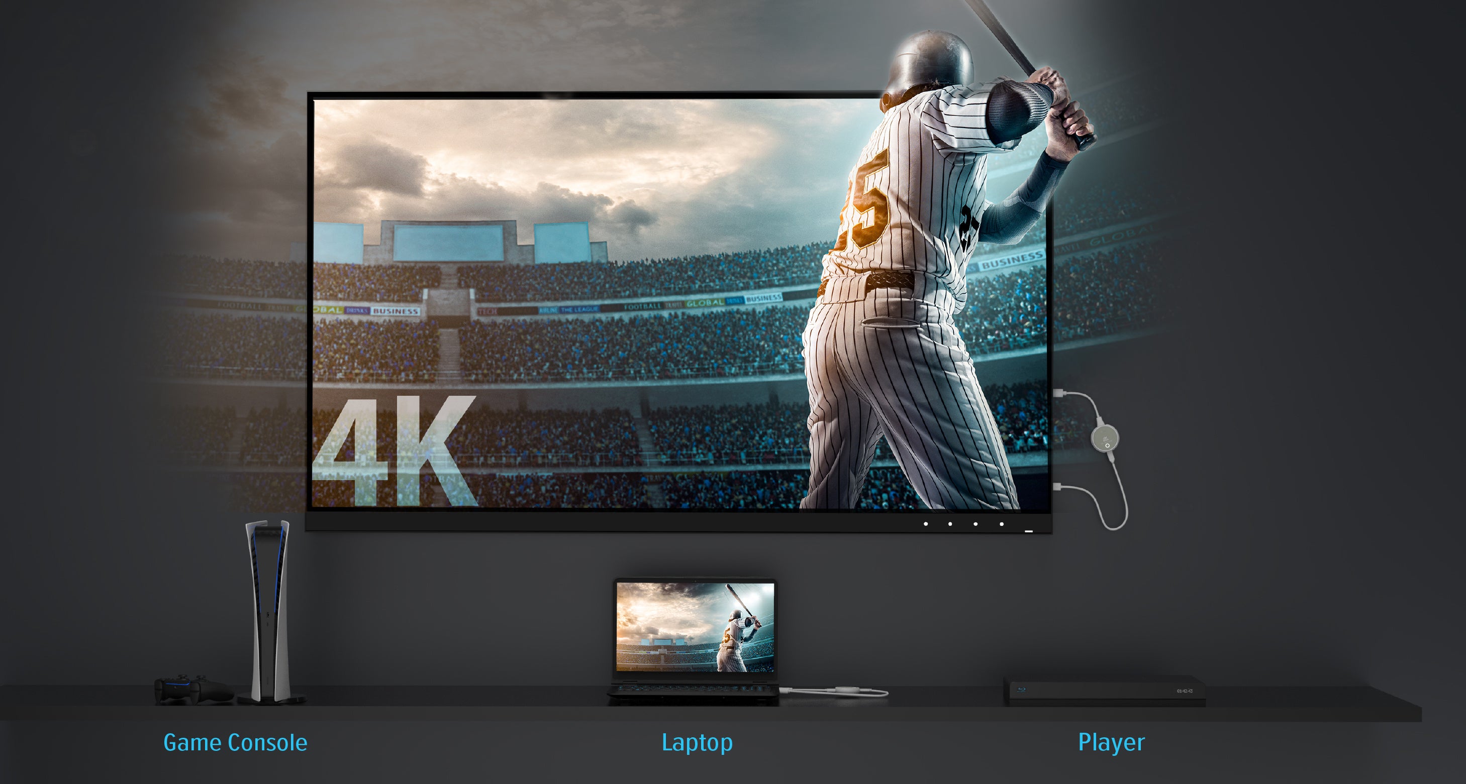最大表示解像度は4K30Hzをサポートしています。本機の給電設計は、固定設置のACアダプターを使わず、テレビとPCのUSBポートに接続すれば使用できるので、利便性に優れています。ゲーム機にも対応しており、離れたテレビにミラーリングして無線でプレイできるので、手元に設置するゲーム機を離れた場所にも設置することが出来ます。