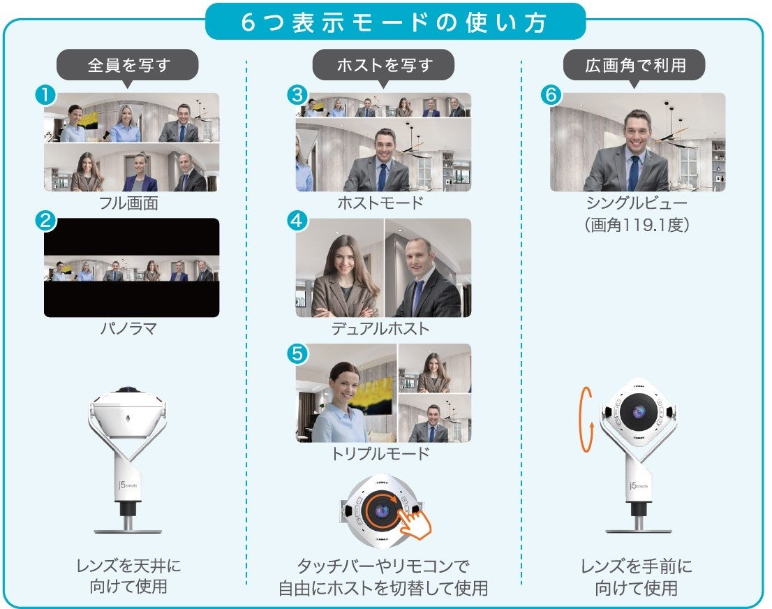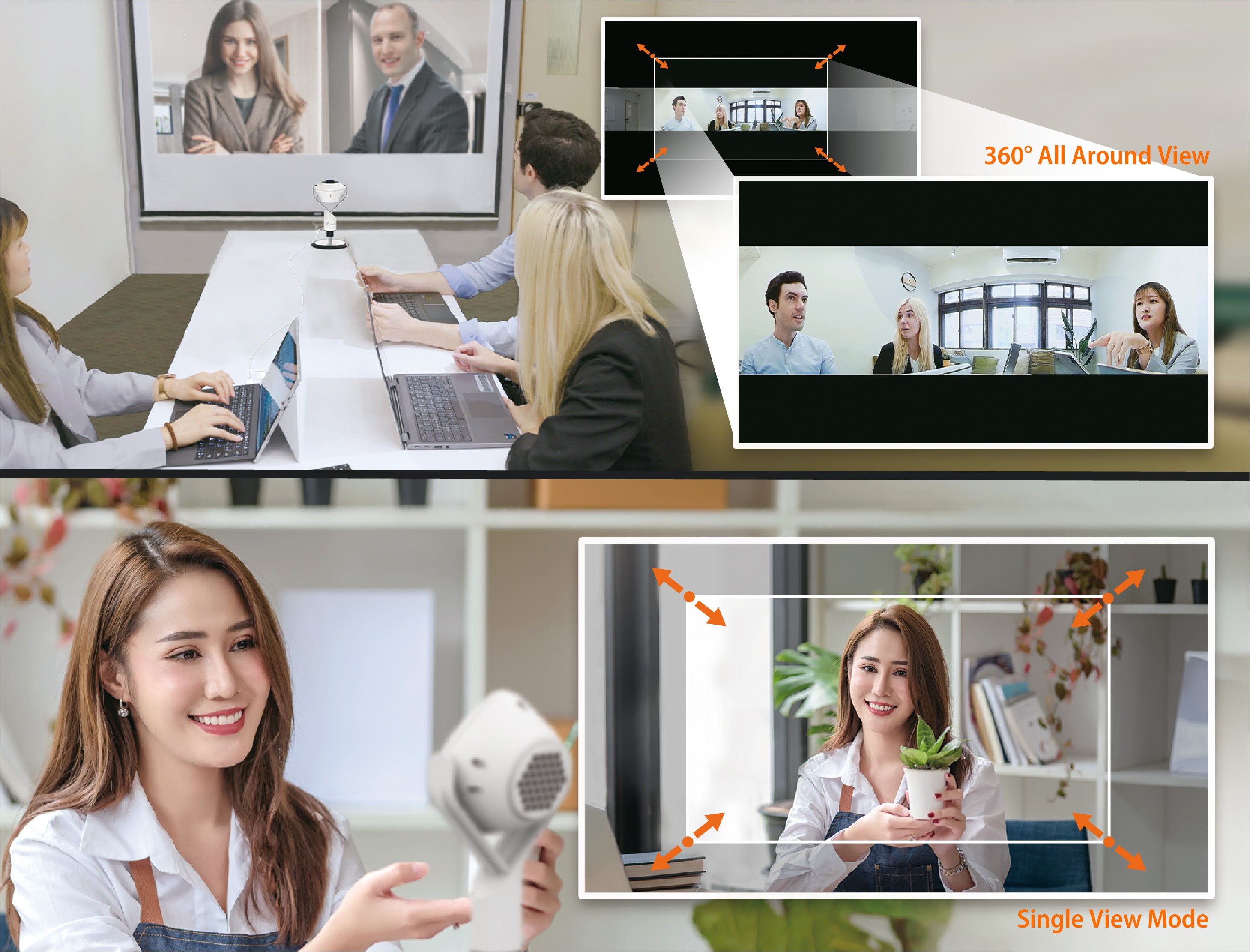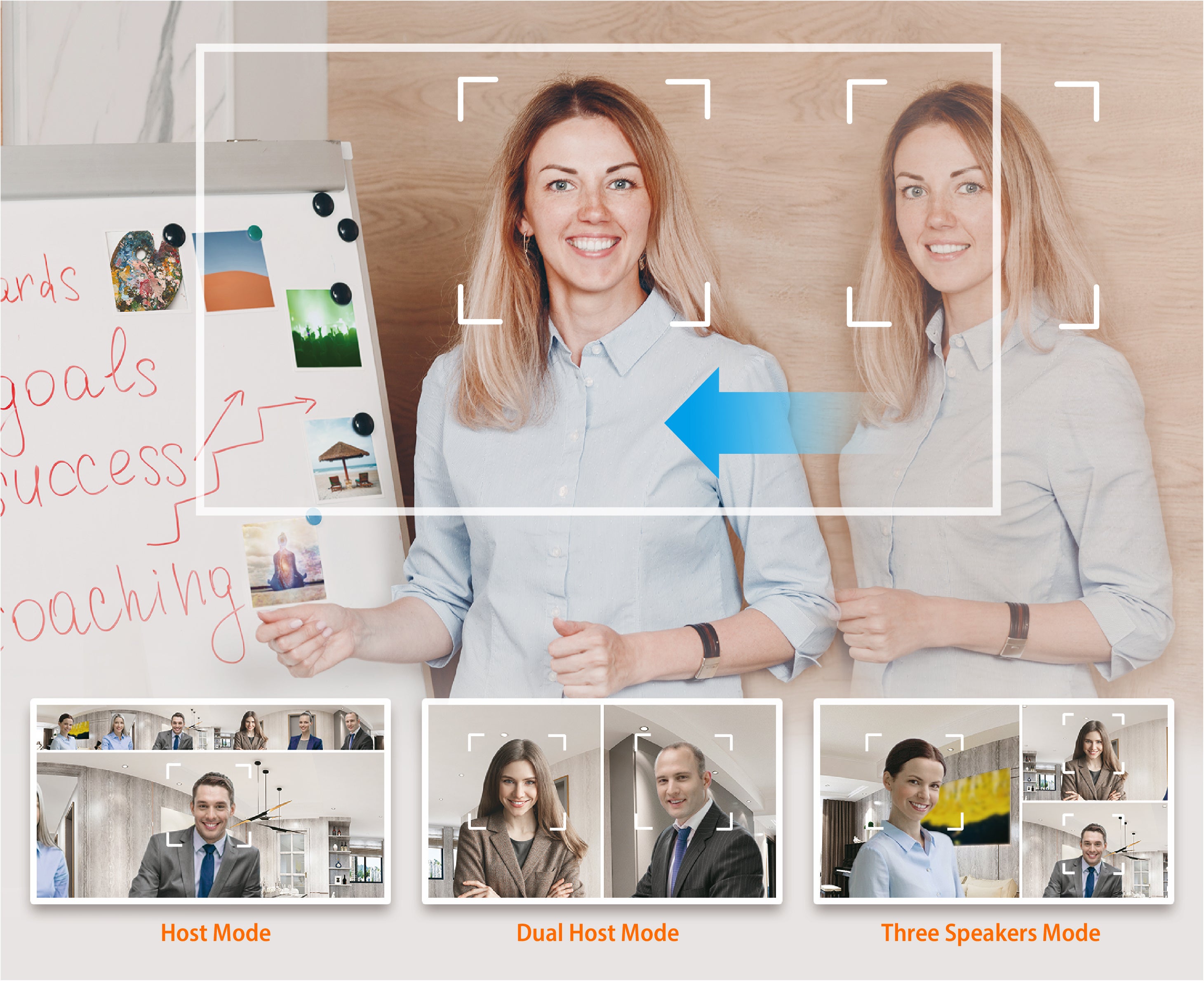 最先端AI機能自動追跡とオートフレーミングを搭載しております。自動追跡とは、表示モードで選んだホストをAI機能で自動フォーカスして追跡することです。オートフレーミングとは、パノラマモードとシングルビューモードで写された参加者の人数に合わせて自動に画角を調整することです。従来テレビ側設置のWebカメラでは、画角により自動追跡には範囲が限られているが、本機の画角は360度ですので、ホストはどこを歩いても追跡できることが一番のメリットです。