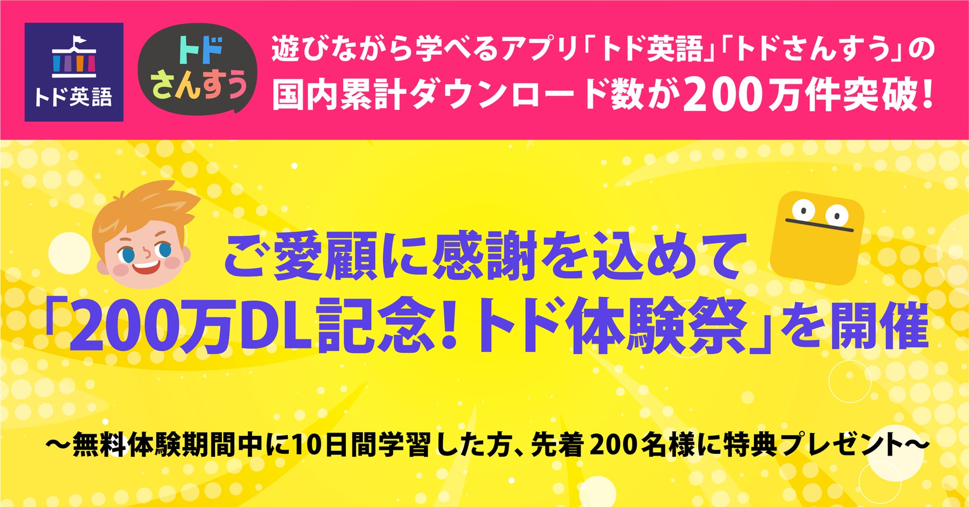 遊びながら学べるアプリ「トド英語」「トドさんすう」の国内累計ダウンロード数が200万件突破!ご愛顧に感謝を込めて「200万DL記念!トド体験祭」を開催