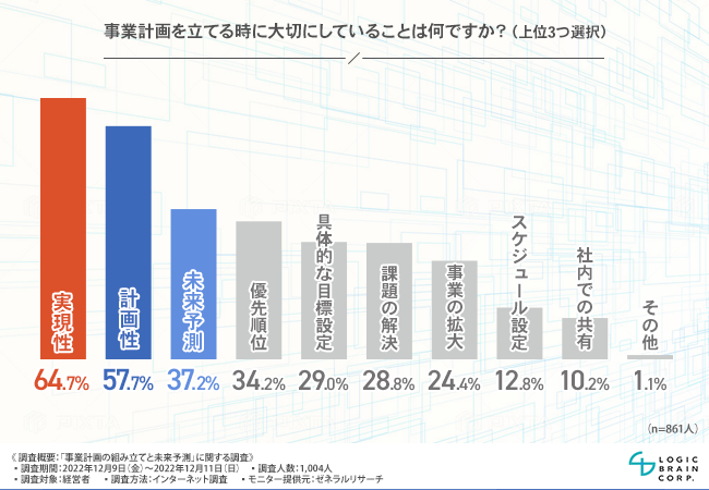 続いて、「事業計画を立てる時に大切にしていることは何ですか?(上位3つ選択)」と質問したところ、『実現性(64.7%)』と回答した方が最も多く、次いで『計画性(57.7%)』『未来予測(37.2%)』と続きました。