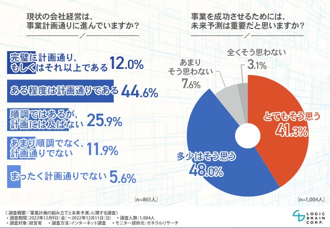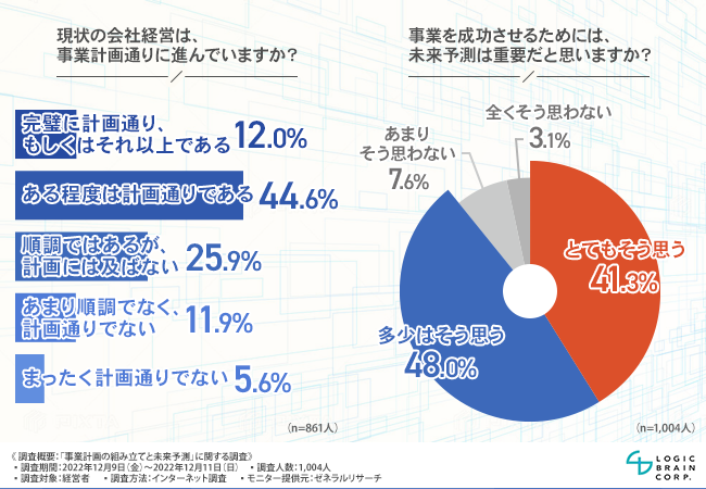 しかしながら、実際には事業計画通りに経営が進んでいない方が4割以上と多く、事業成功には未来予測が重要だと考えている方が多い結果となりました。