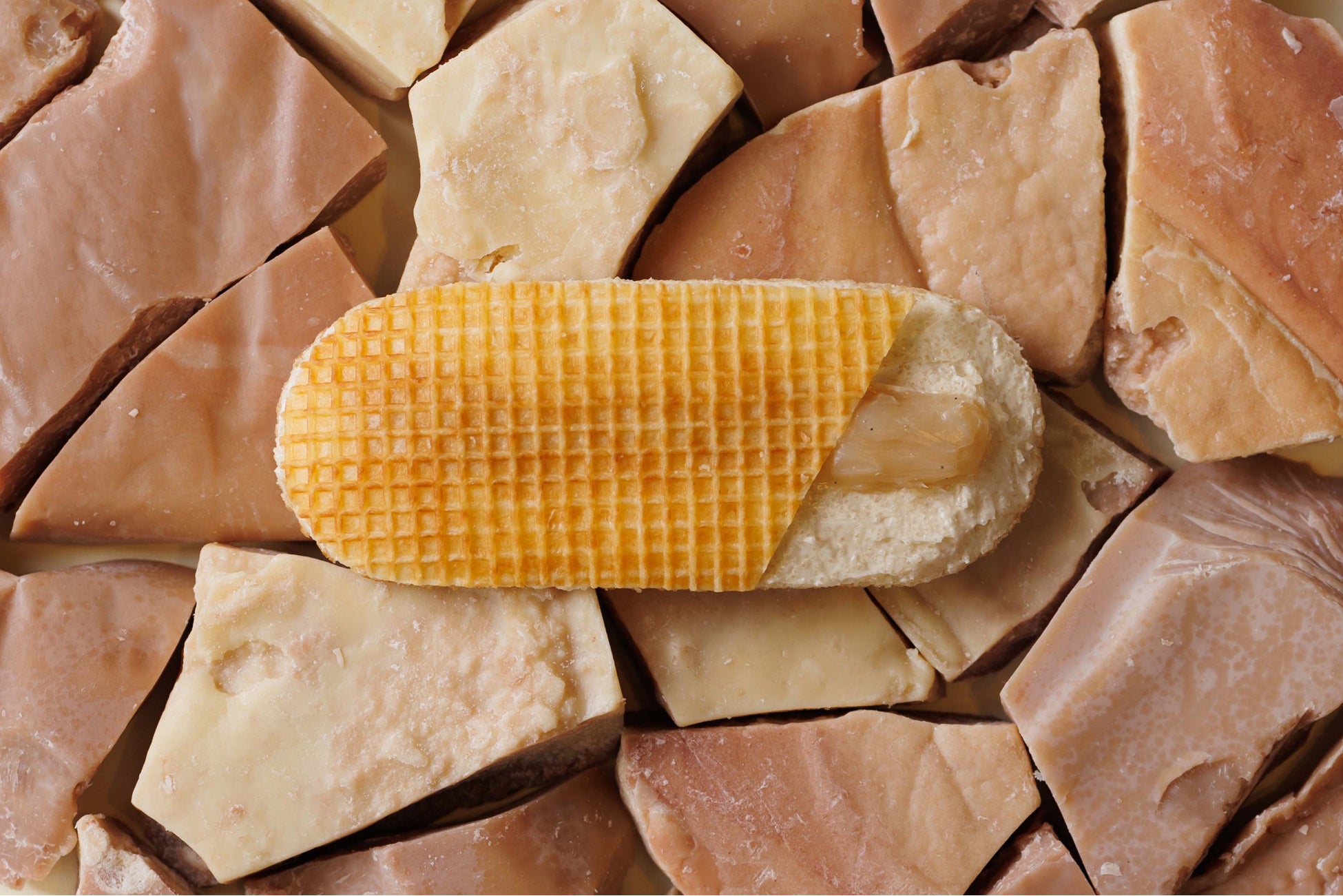 「バターのいとこ」発売当初から全てのレシピ開発に携わるパティシエユニット「Tangentes」の後藤裕一氏と仲村和浩氏が味を監修。原料には、カカオ豆からカカオパウダーを作る過程で生まれるカカオバターと砂糖、スキムミルクを使用しています。一般的には脱臭処理をして流通されるカカオバターをそのまま使用し、本来の風味を生かしたレシピにすることで、ホワイトチョコレートらしいクリーミーな優しい甘味だけでなくほのかにカカオの香りを感じられるスペシャルな味わいに仕上がりました。