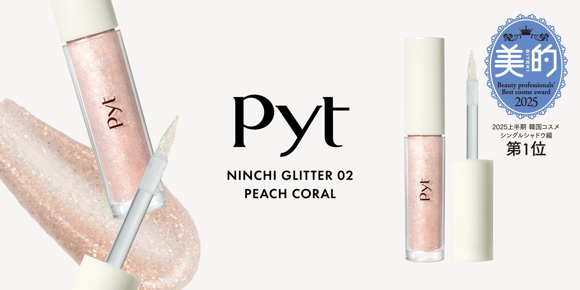 STORiiY(ストーリー)株式会社(本社:東京都渋谷区、代表取締役:渡辺真大)が展開するプロフェッショナルメイクブランド「Pyt(ピュット)」より、2025年6月6日に発売された「NINCHIグリッター 02 ピーチコーラル」が、美容誌『美的』の「美容賢者が選ぶ2025年上半期ベストコスメ」韓国コスメ・シングルアイシャドウ部門にて、第1位を受賞いたしました。