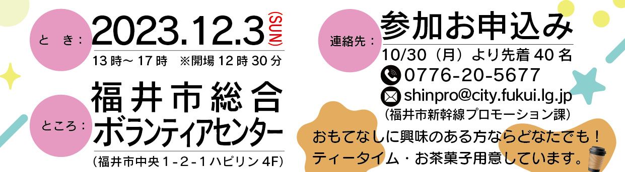 【12/3(日)開催】(参加ボランティア募集)北陸新幹線福井開業に向けたおもてなしを考えるワークショップ【福井市】