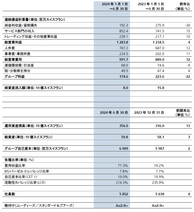 グループの2024年上半期の総営業収益は前年同期比4%増の12億8,000万スイスフランとなりました。中核事業のサービス収益は、仲介事業からの収益と投資・管理手数料の増加を受けて、15%増の8億5,240万スイスフランとなりました。2023年は金利上昇による大幅なプラス効果が見られましたが、2024年上半期は金利環境の正常化に伴い、純金利収益は30%減の1億9,230万スイスフランとなりました。トレーディング収益・その他営業収益は、債券ポートフォリオの金利および評価益、顧客活動の活発化、資産基盤の拡大を反映し、10%増の2億3,910万スイスフランとなりました。