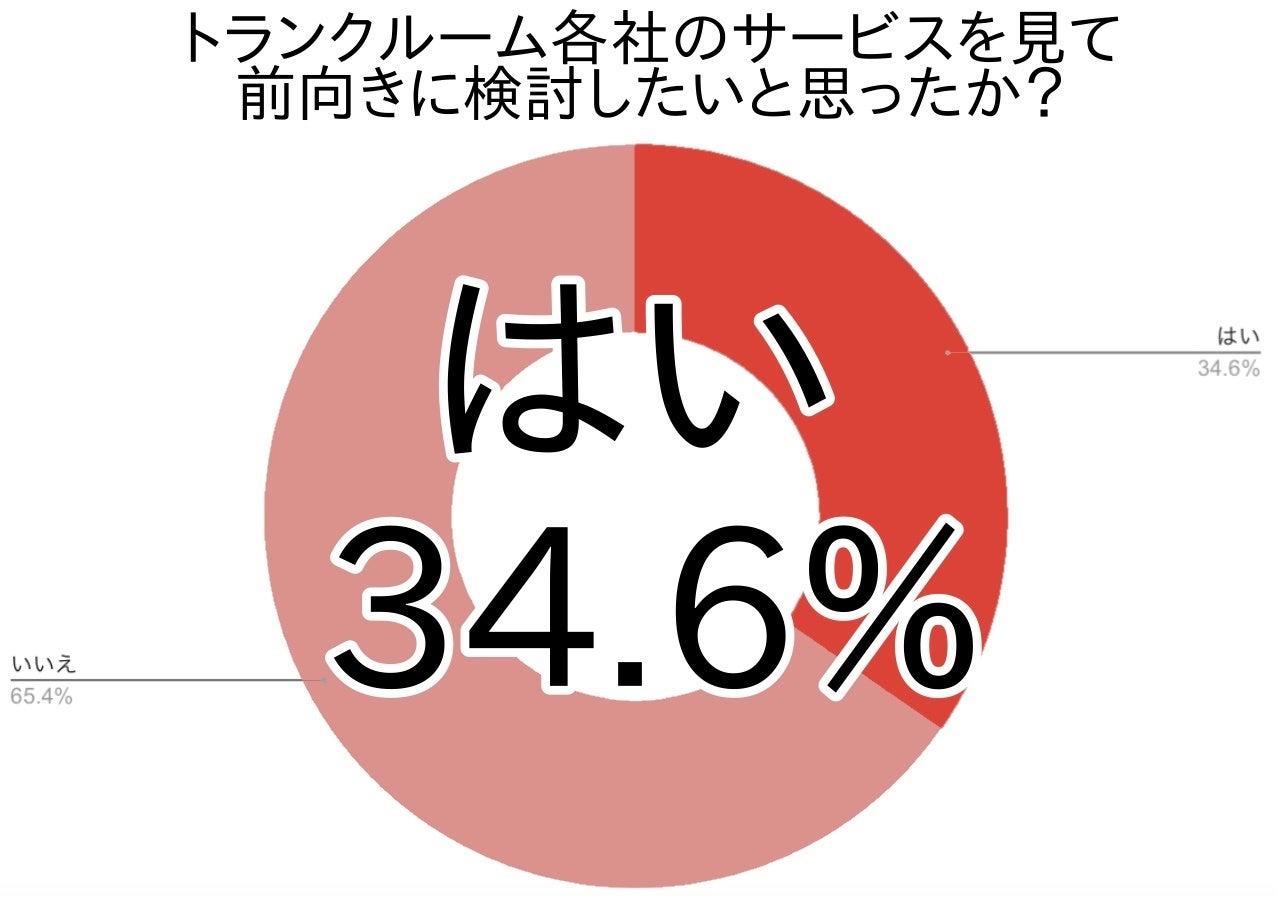 最後に、トランクルームのサービスを実際に理解した上で利用を前向きに検討したいかを尋ねました。34.6%の人がトランクルーム利用を前向きに検討したいと答えたのは、実際にサービスを知ったことでのイメージアップも大いに影響していると推測されますが、それでもまだ実際の利用には踏み切れない要因が残されていることがよくわかる結果とも言えます。