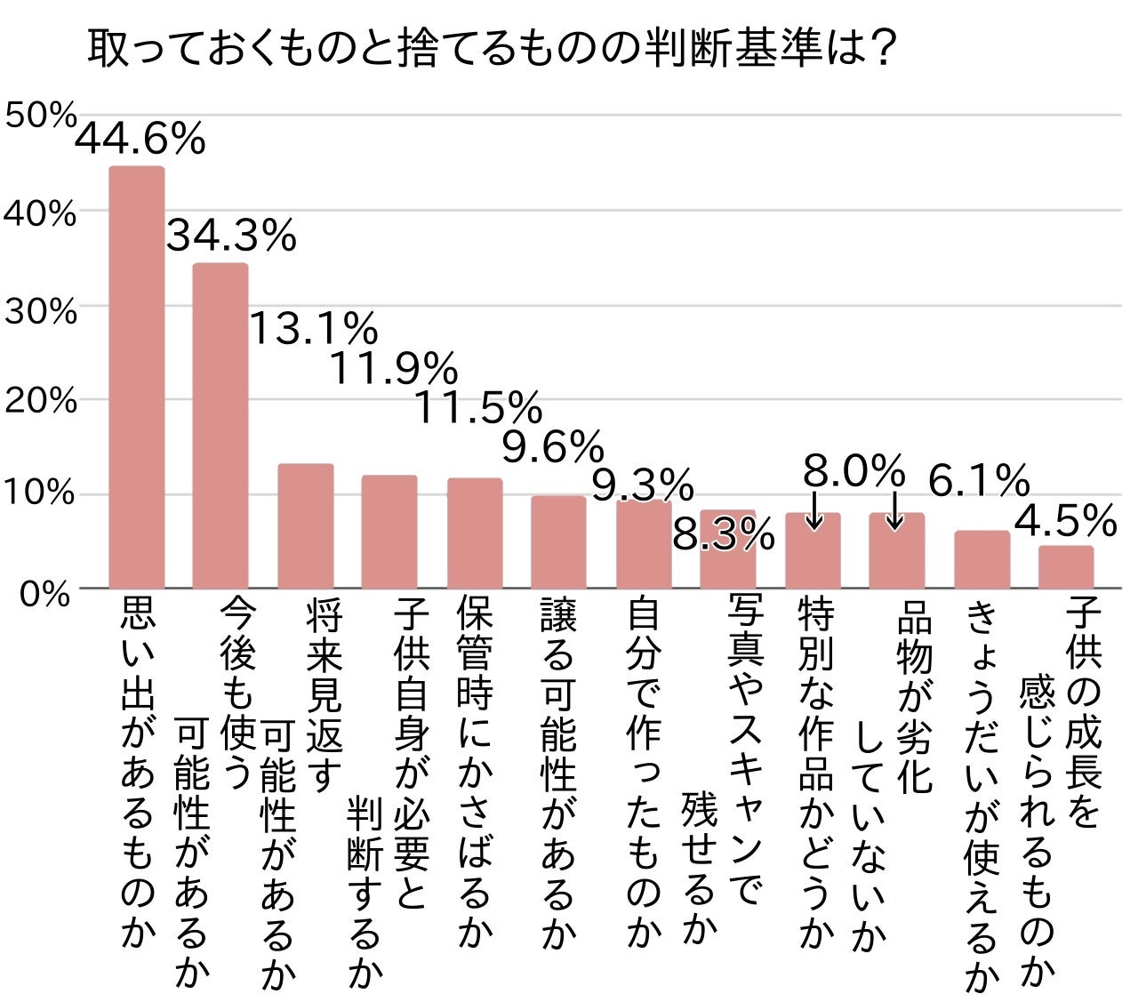 しかし、思い出があるものを全部取っておくとキリがないから「将来見返す可能性があるか(13.1%)」「子供の成長を感じられるものか(4.5%)」という判断基準でふるいにかけ、将来改めて見る機会を持ちたいものだけ残すというマイルールを作っていた方も多数いました。