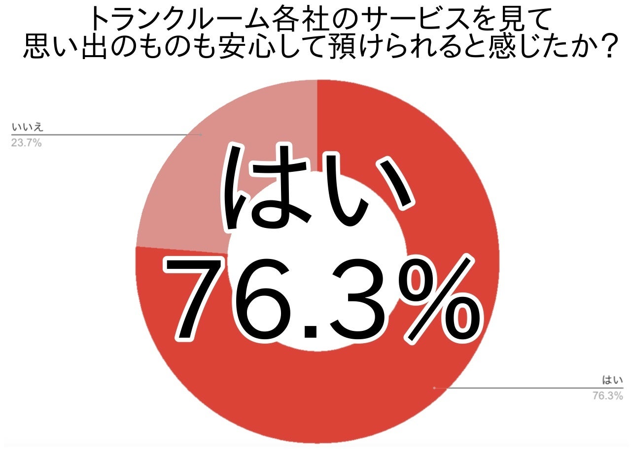 実際にトランクルーム各社のサービスをアンケート回答者にご確認いただいたところ、トランクルームに思い出のものを安心して預けられると感じた方は約8割(76.3%)でした。