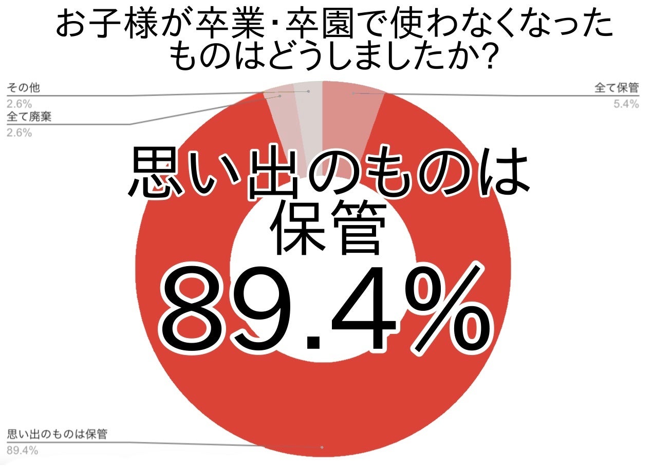 空気が暖かくなり日差しも明るくなってくる春先。お子様が卒業・卒園を迎える方も多いのではないでしょうか。卒業・卒園を機に使わなくなってしまうものは多々ありますが、やはり思い出が詰まって処分しづらいものも出てきます。そこで今回はアンケートをもとに、卒業・卒園を機に残すもの・処分するものの選別・保管アイデアについて掘り下げます。普段自分一人では考えない発想や参考になるアイデアにも出会えるかもしれません。興味深い結果を是非ご覧ください。