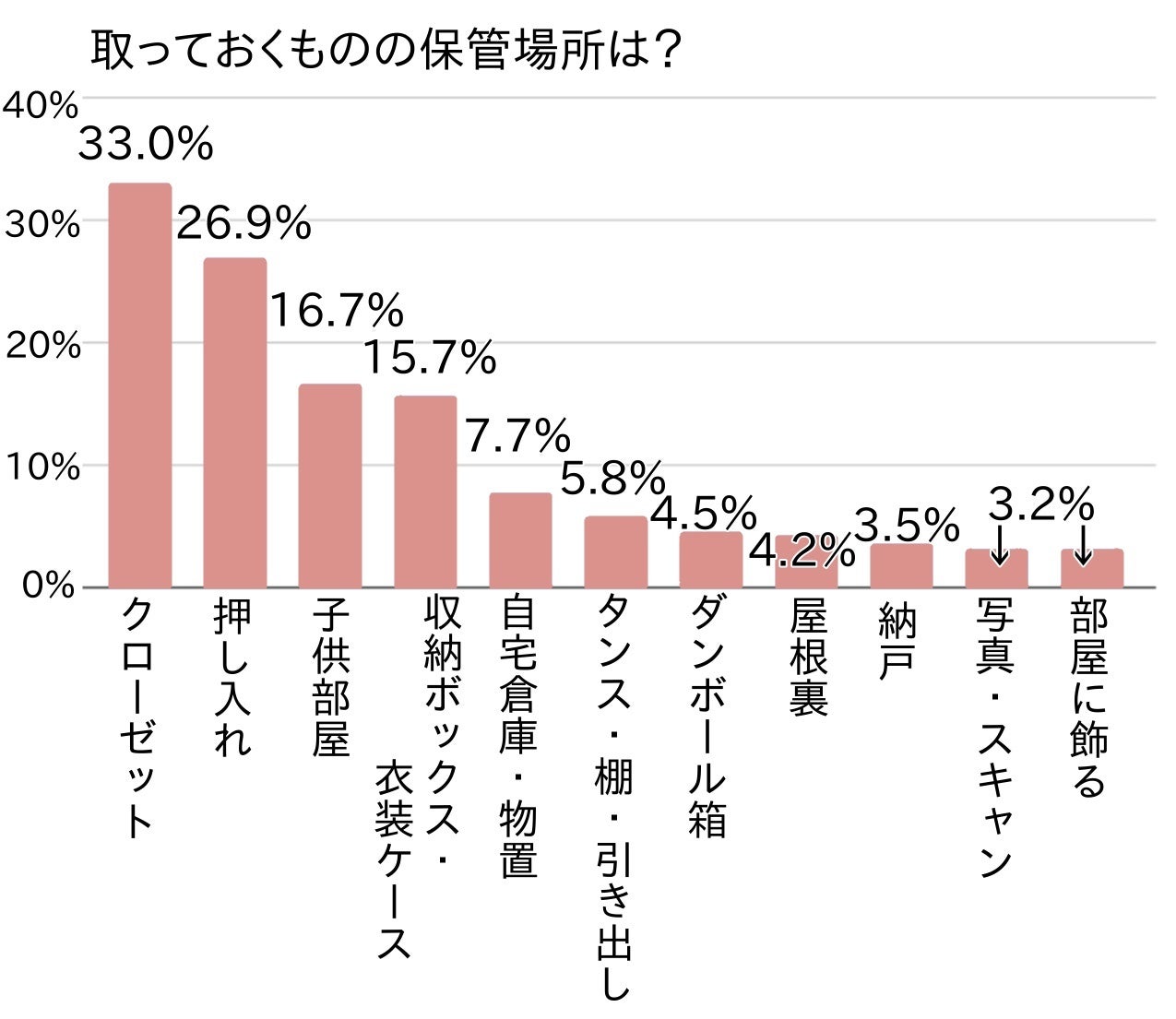 今回特に頻繁に見受けられたのが、子供専用の思い出ボックスを設け、その中に入る分だけ保管するというルールを決めているという方法でした。「収納ボックス・衣装ケース(15.7%)」や「ダンボール箱(4.5%)」がそれにあたり、その箱をクローゼットや押し入れに配置していることがほとんどでした。