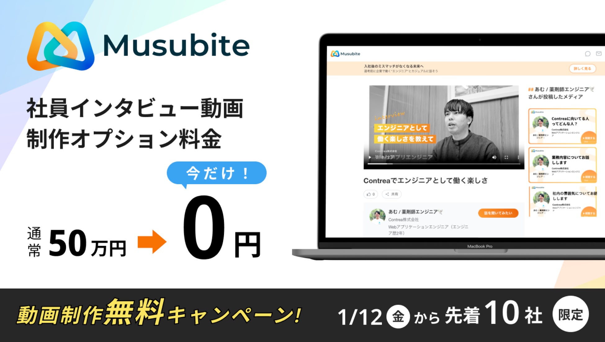 ITエンジニアのつながりを活かしたフォロワー採用サービス『Musubite(ムスビテ)』を運営する株式会社ニュートラル(本社:大阪府大阪市、代表取締役:長岡勇輝)は、動画制作のオプションを開始いたしました。新オプションのリリースを記念し、特別キャンペーンを1月10日から10社限定で実施します。