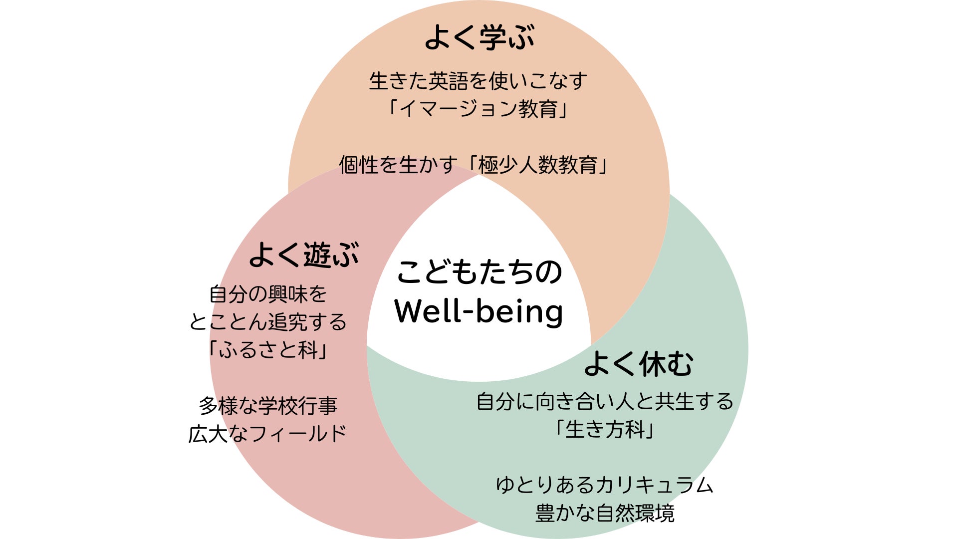 LCAきたかる森のインターはこどもの今と未来が真に幸福なものであって欲しいという願いの下で生まれた学校です。すべての教育活動の中心にはWell-beingがあります。未来のために今を犠牲にするわけでも、未来を考えずに今だけを見るわけでもなく、こどもの今から未来まで、一生涯の幸福を保障することを目指しています。