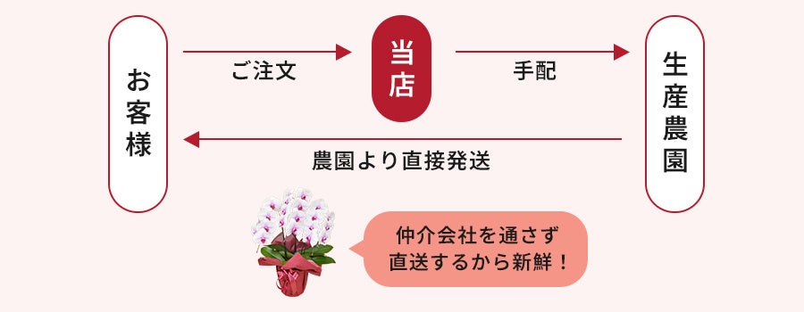 当店では、農園で生産した胡蝶蘭を直接お客様に発送し、一番鮮度の良い状態でお届けします。