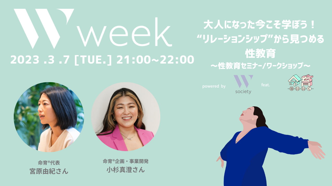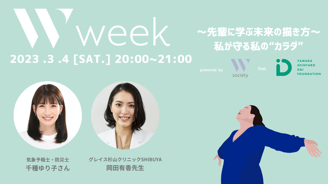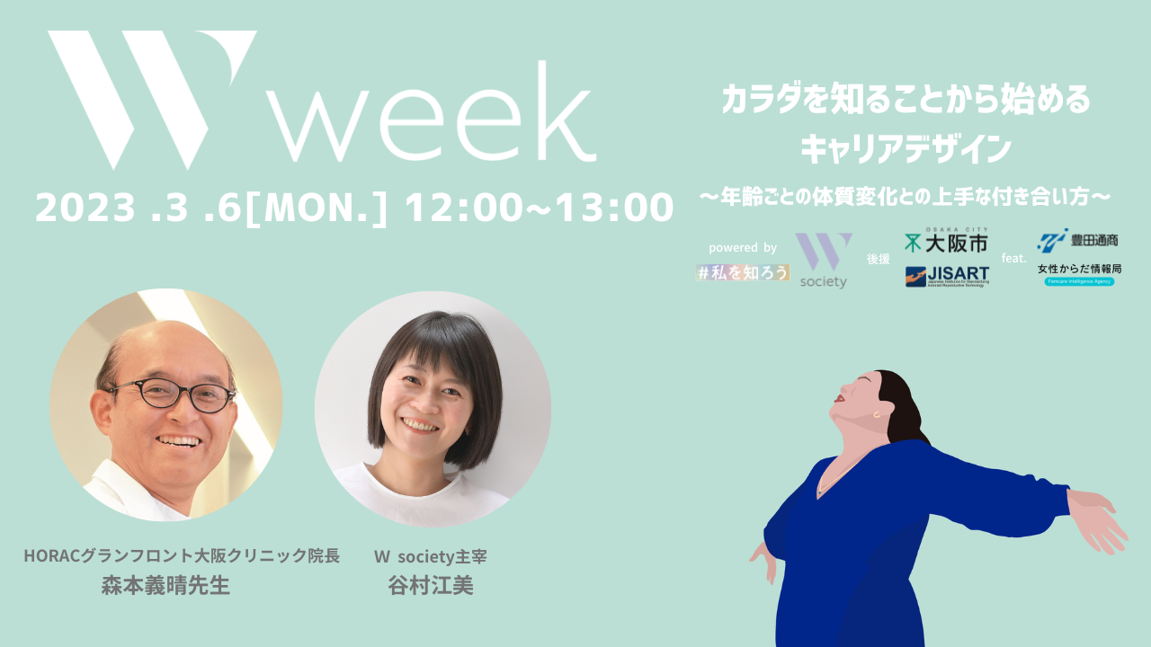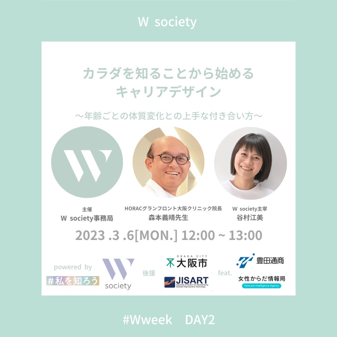 今年の「W week」初日は、公益財団法人山田進太郎D&I財団の特別協力のもと、STEM(理系)分野に興味を持つ中学生から大学生女子に向けた進路・キャリアと自分のカラダについて学ぶライフデザインセミナーを開催。2日目は、一般社団法人JISART後援、豊田通商株式会社、女性からだ情報局の特別協力のもと、大阪エリアに拠点のある企業や働く女性に向けて、ライフデザインセミナーを開催。3日目は、医師や専門家、クリエイターからなる性教育情報サイト「命育®」の特別協力のもと、性教育の土台となるリレーションシップや、多様性・ジェンダーのあり方を大人自身も学び、考えるセミナー/ワークショップを開催します。いずれのイベントにも、ゲストに医師や専門家など様々な分野で活躍されているエキスパートをお招きし、セミナーやワークショップを通じて、多角的な視点から、女性のカラダと心の今を知り、学ぶ機会を提供します。