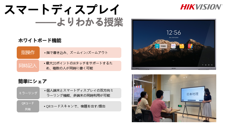 ホワイトボード機能、双方向ミラーリング機能を備えています。スマートディスプレイを利用することで授業の効率が上がれば、先生の負担も軽減されます。