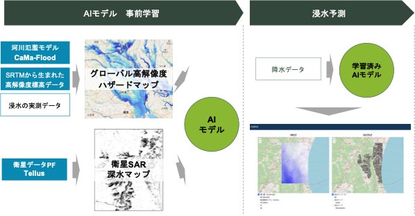 洪水物理シミュレーションと衛星観測のデータ組み合わせるために、柔軟にモデル学習を行える機械学習の性質を利用しました。開発したモデルは、クラウドサーバー上に展開しユーザーが降水データをアップロードすれば、対象エリアの洪水推定結果が地図上に表示されるアプリケーションとして提供することを予定しています。