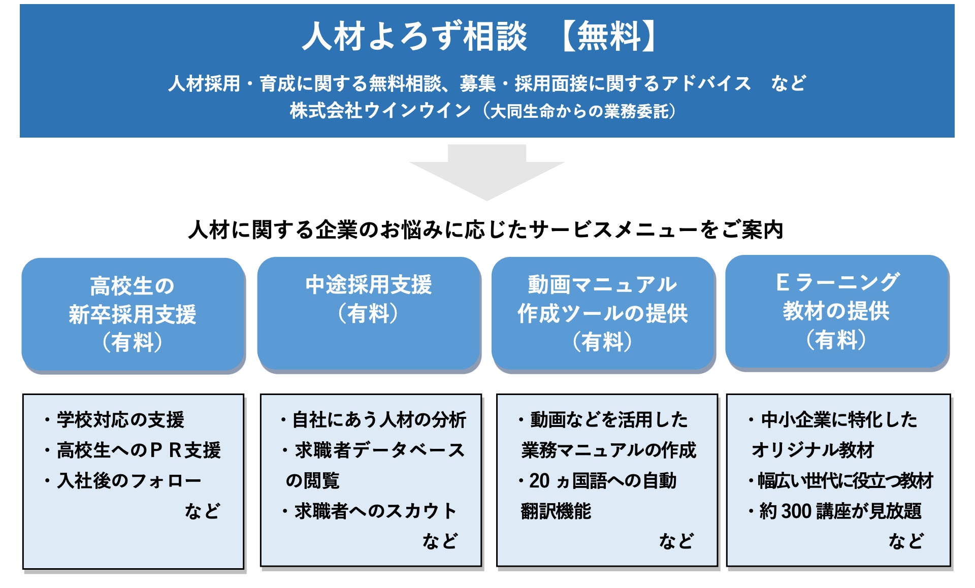 本サービスは、大同生命の全国に広がるネットワークと、弊社が創業から培ってきた採用のノウハウを組み合わせ、 無料で採用課題を解決する「人材採用・育成に関する無料相談(人材よろず相談)」や 無料相談内で把握した企業のお悩みにあわせた4 つの有料サービス(サービス提供先は別紙「サービス提供企業の概要」をご確認ください)で、中小企業の人材に関する課題解決支援を行うものです。