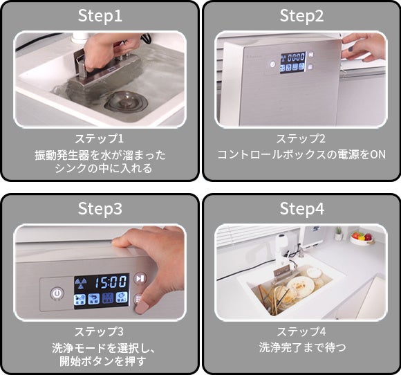 水を貯めたシンクに、使い終わったお皿や調理器具を入れ、スイッチをONにするだけ!