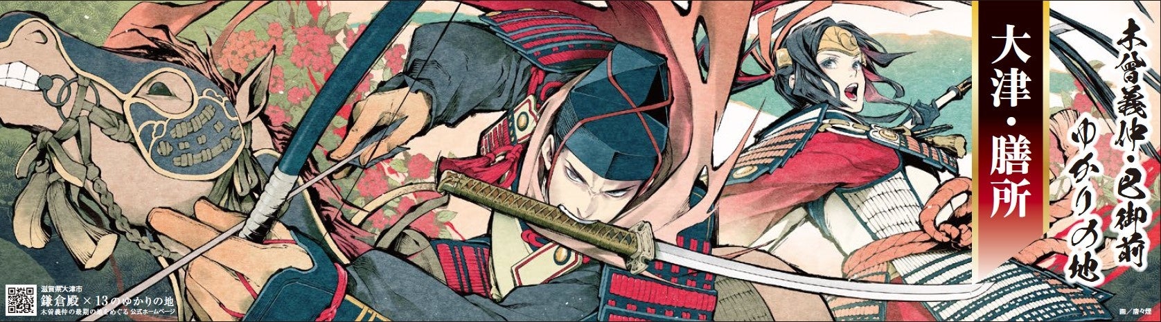 大河ドラマ「鎌倉殿の13人」に登場・活躍している木曽義仲公は、その生涯を大津市で終え、義仲寺にお墓があります。その最寄りの駅であるJR膳所駅にびわ湖大津ふるさと観光大使である漫画家の唐々煙氏に新たに描き下ろしていただいたイラストを掲示しています。ぜひ、木曽義仲や巴御前にゆかりのある大津・膳所にお越しください。