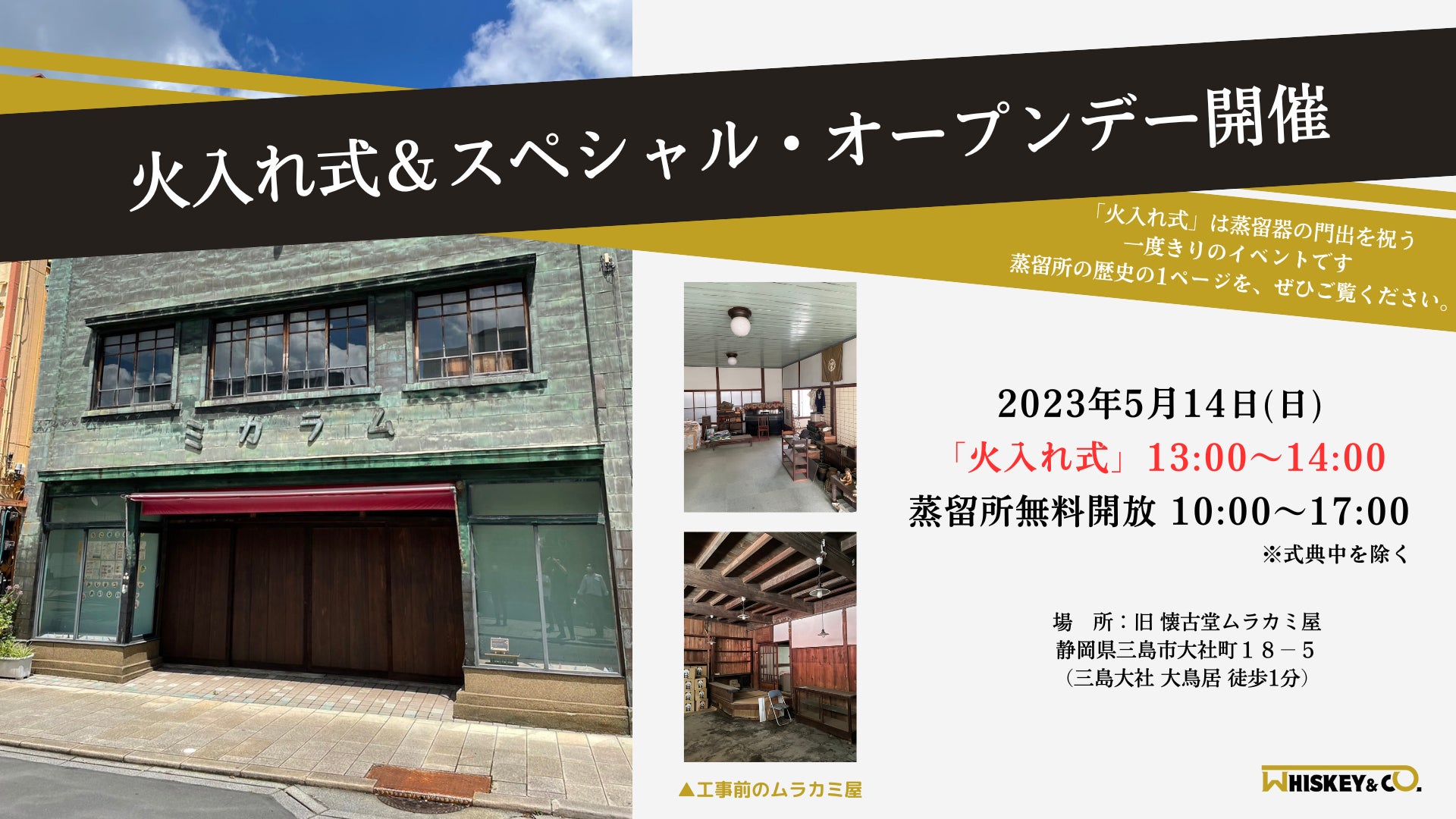 三島市限定のウイスキーづくりに取り組むWhiskey&Co.は、5月14日(日)、当社初の蒸留所の火入れ式を開催。今回特別に蒸留所を無料開放し、どなたでもご見学頂けます。