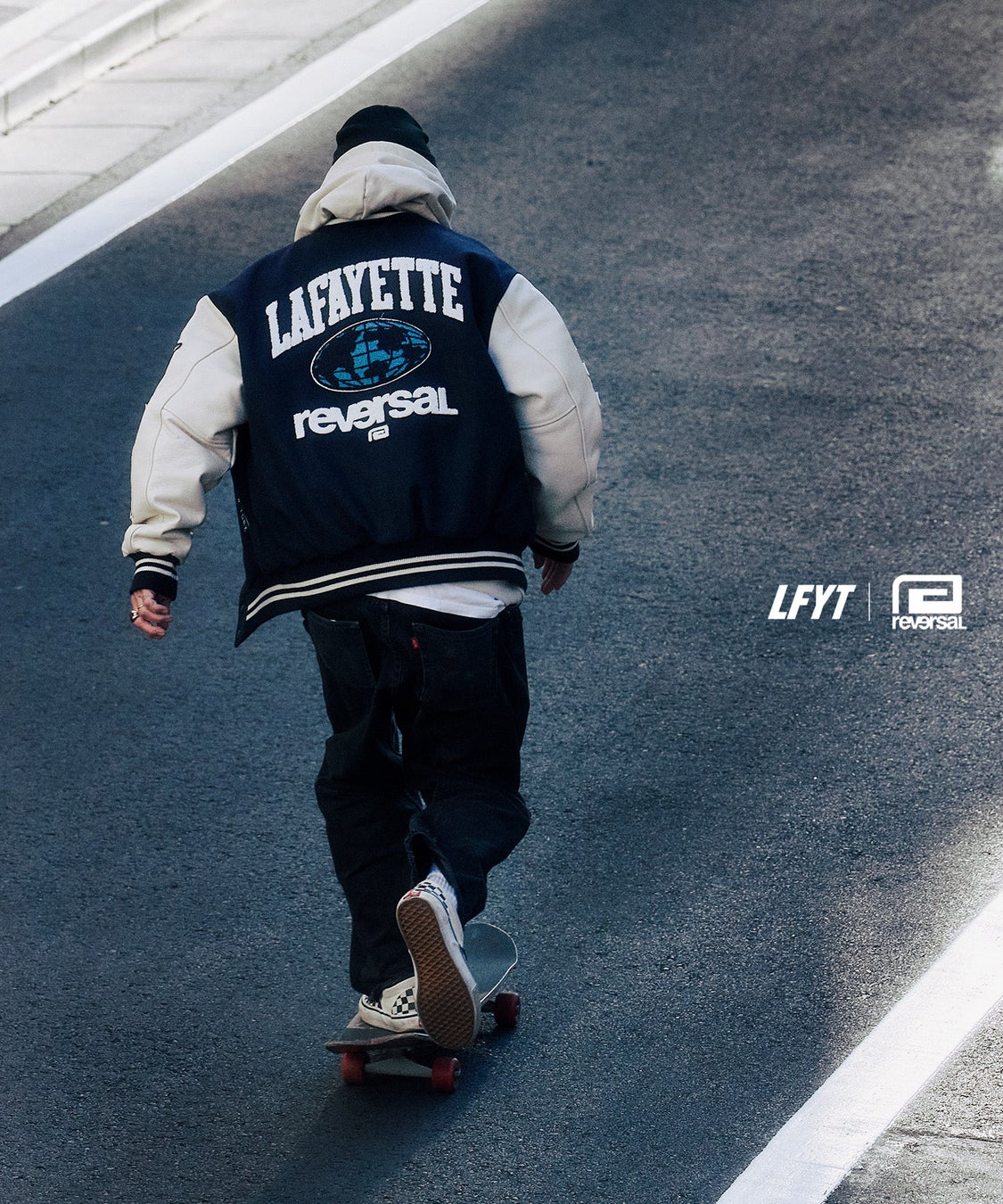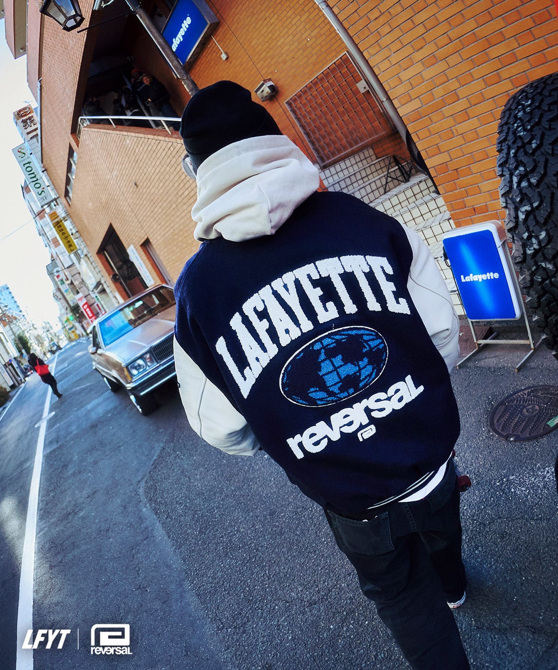 コラボレーションコレクションのラインナップは両ブランドのアイコンをサガラワッペンと刺繍でふんだんに落とし込んだスタジャンをはじめ、HIPHOPカルチャーのRAP TEEをモチーフにデザインされたグラフィックTシャツ、Lafayetteのロゴの一部を立体刺繍のreversalロゴで表現したコラボならではのスペシャルなスナップバックキャップなどコラボならではの魅力が詰まったアイテムがリリースされている。