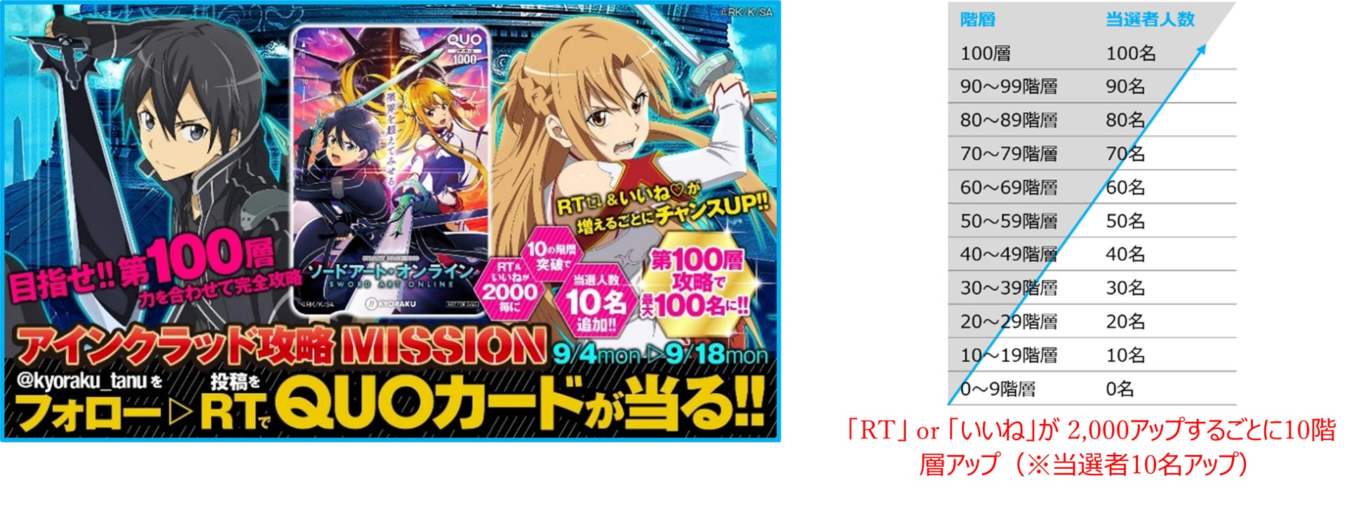 「スマートぱちんこ ソードアート・オンライン」の全国導入を記念して、9/4(月)~9/18(月)までKYORAKU公式「X」(旧:twitter)にて、プレゼントキャンペーンを実施いたします。“RT”もしくは“いいね”が2,000アップする毎に10階層を突破(=当選人数10名追加)、第100層まで攻略できれば抽選で100名様にオリジナルQUOカード1,000円分をプレゼントします!