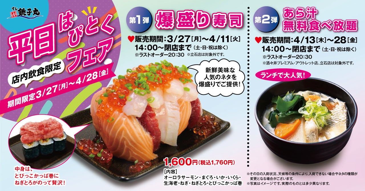 「真心を提供し、お客様の感謝と喜びを頂く」ことを経営理念として、すし銚子丸など93店舗(2023年2月末時点)を展開している外食企業・株式会社銚子丸(本社:千葉県千葉市美浜区、代表取締役:石田 満)は、期間限定でハッピーでお得なメニューが楽しめる「平日はぴとくフェア」を3月27日(月)~4月28日(金)まで開催いたします。