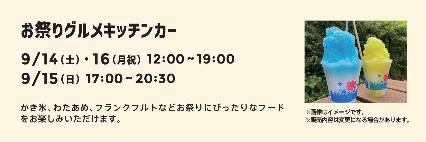 そのほか、お祭り気分を体感できる射的や輪投げなどの縁日や、芸術の秋にちなんだ「エッグマラカス」や「Myおうちバッグ」の制作体験のワークショップを実施。また、お祭りにぴったりのキッチンカーも登場します!