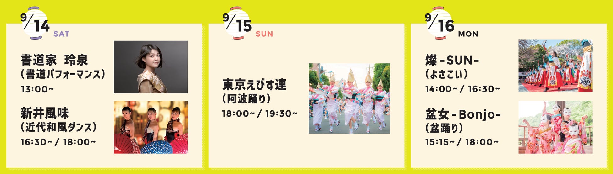 『書道家 玲泉』、『新井風味』、『東京えびす連』『燦-SUN-』、『盆女‐Bonjo‐』が出演するスペシャルステージです。この時期にぴったりな“和”をテーマにしたパフォーマンスをご覧ください。