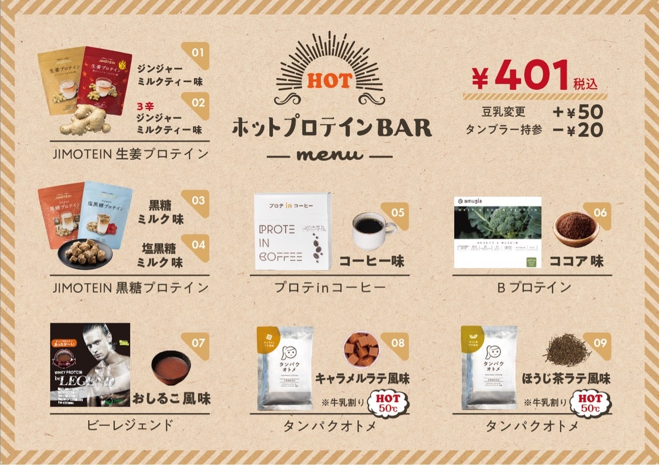 期間中、9種類のホットプロテインをテイクアウトできる「ホットプロテインBAR」をオープンいたします。