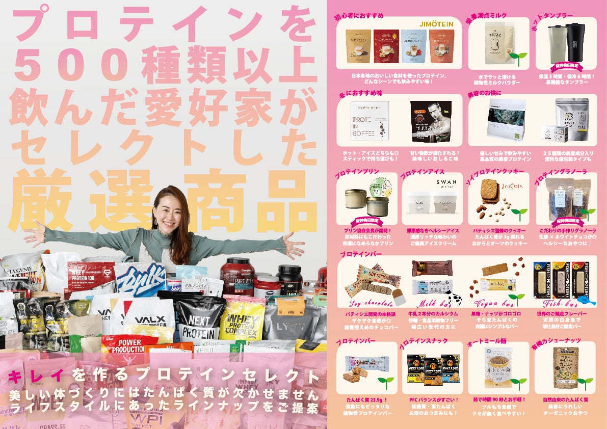これまでに500種類以上のプロテインを飲み、「マツコの知らない世界」や「めざましテレビ」など多くのメディアで出演実績のある運動しないプロテイン愛好家「プロテインひろこ」が厳選したアイテムが並びます。