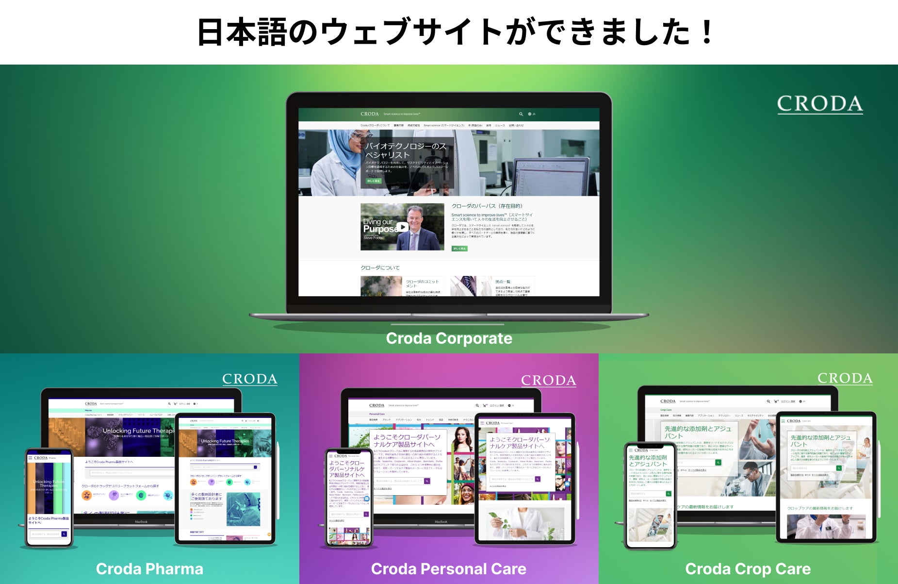 これにより従来のPersonal Care(化粧品原料)日本語版ウェブサイトに加え、コーポレートサイト及びライフサイエンス事業のPharma(医薬品原料)・Crop Care(農薬アジュバント・界面活性剤)の日本語版サイトも加わり、日本のお客様にクローダの製品・活動に関する情報をお届けできるようになりました。 ぜひ、弊社の新しい日本語サイトにお立ち寄りください。