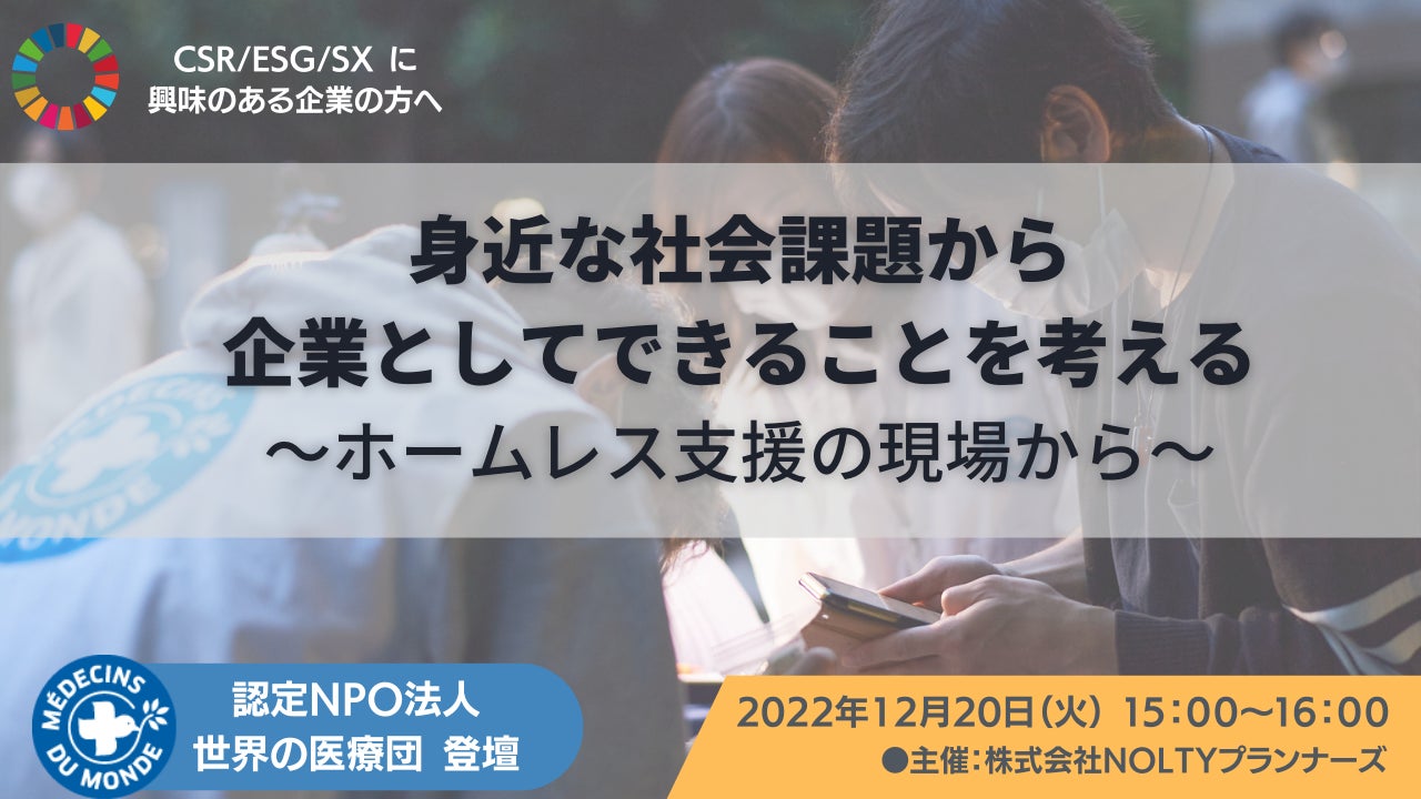 サステナビリティの社内推進をサポートする株式会社NOLTYプランナーズが、特別オンラインセミナーを開催します。世界の医療団からゲストスピーカーをお招きし、今実際に発生している社会課題と、企業ができる支援について考えます。