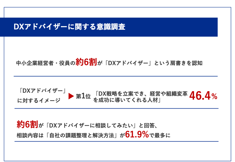 今回は、DX推進を行っている中小企業(従業員数300名未満)の経営者・役員110名を対象に、DXアドバイザーに関する意識調査を実施しました。