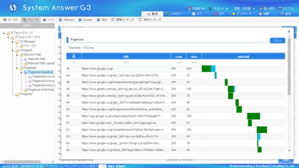 Linuxエージェントからアクセス対象のURLやFQDN、IPアドレスに対する応答値、パケットロス、経路情報、コンテンツ毎の時間計測を可視化します。本機能を利用することで各エージェントからアクセス対象先までのネットワークパス(経路間の応答値やパケットロス率など)、ページロード(WEBサイト等のCSSファイルやJavaスクリプトなどのコンテンツの読み込み時間)を表示することができます。G3と連携することで計測値に対するしきい値やタイムアウト、エラーアラートを検知できます。