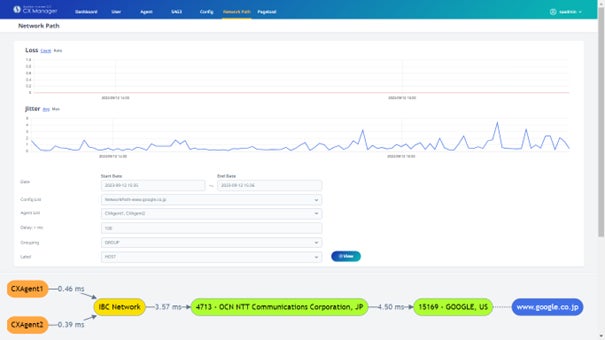 監視元となるエージェントから監視先までのネットワークパスを、ホップ毎にIP アドレス、応答値(平均、最大、最小)、パケットロス、ジッターなど詳細な情報を表示します。
