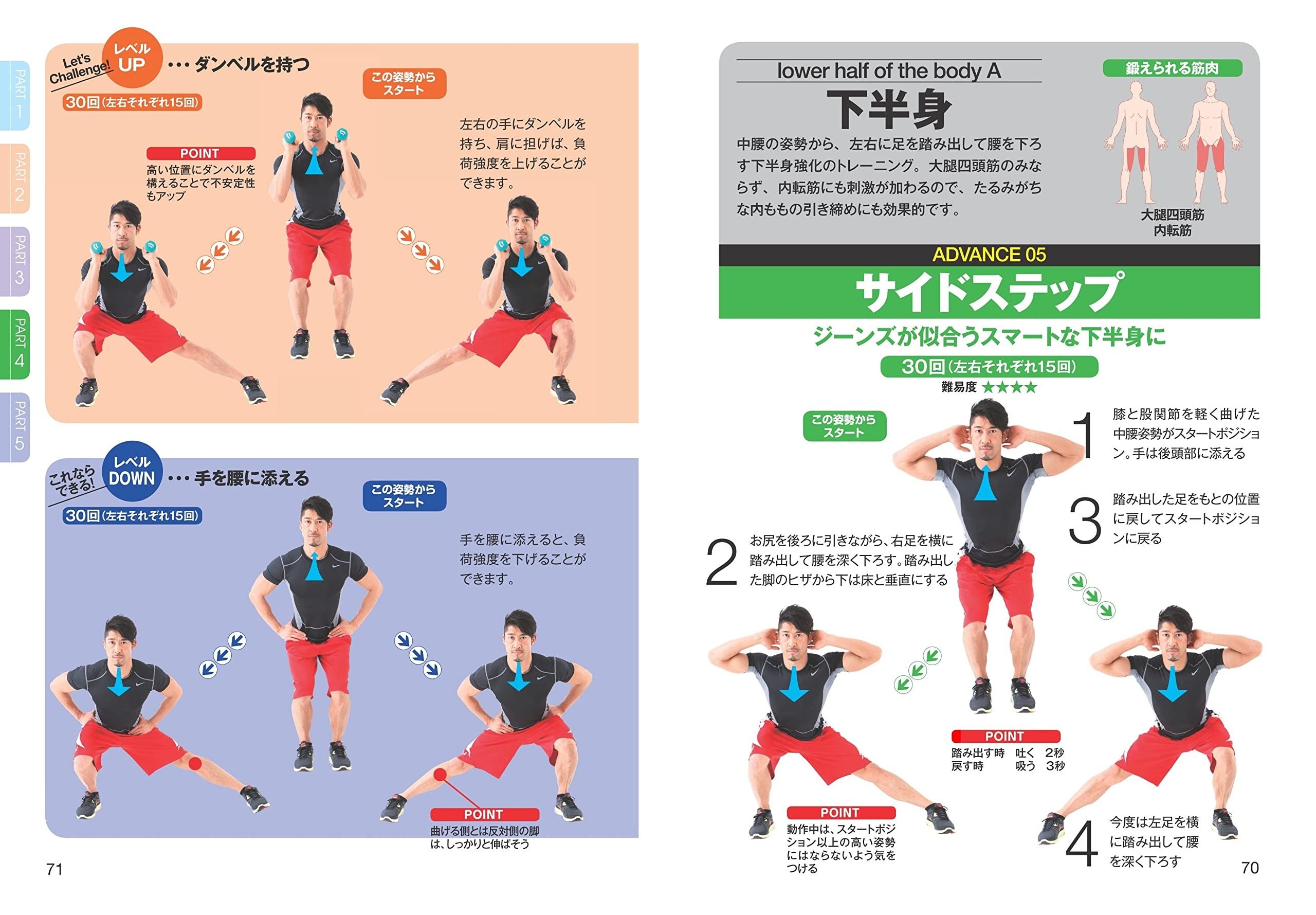 1日約5分で好きな時にできるので無理なく続けられるほか、各トレーニングで負荷強度を上げたレベルアップやトレーニングが厳しいと感じる人に向けて負荷強度を下げたレベルダウンを設けており、誰でもできるように解説しています。