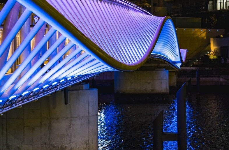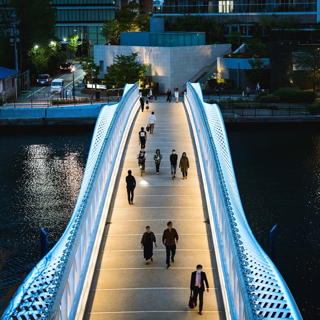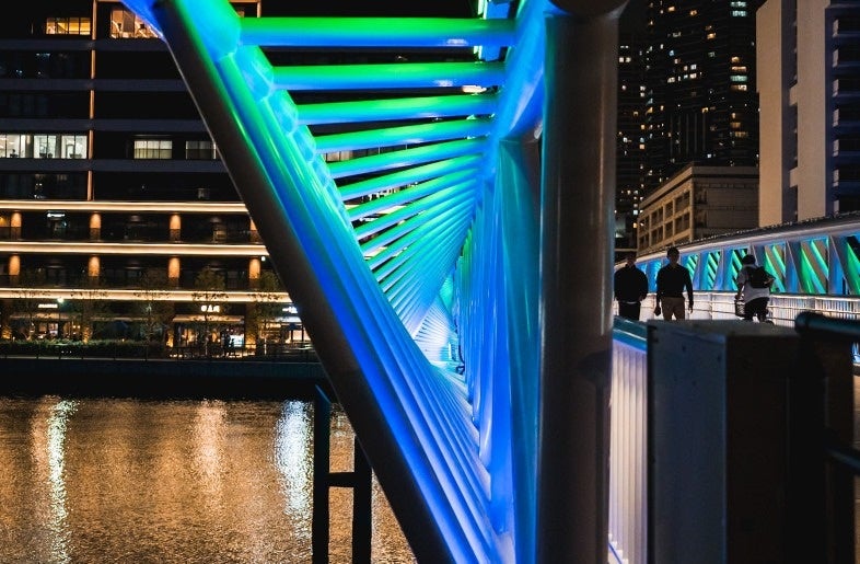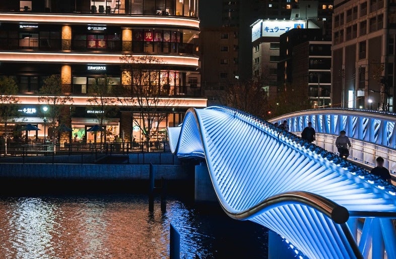 勝どき駅と晴海三丁目を結ぶ歩行者専用橋「黎明小橋(れいめいこばし)」は、2024年3月25日に開通しました。朝潮運河をまたぎ、勝どきエリアの新たな賑わいと憩いの場として広大な緑地と水辺を抱く街「GRAND MARINA TOKYO」へとつながる同橋は、水面に波打つような柔らかな曲線のデザインが、おだやかな波のイメージを表現しています。連続する白い部材を水上に浮かべる構成により、繊細な動きが水面のきらめきと重なり、ウェーブの美しさを際立たせています。さらに、水面に映り込む橋の姿は、重なり合ういくつもの波を思わせます。