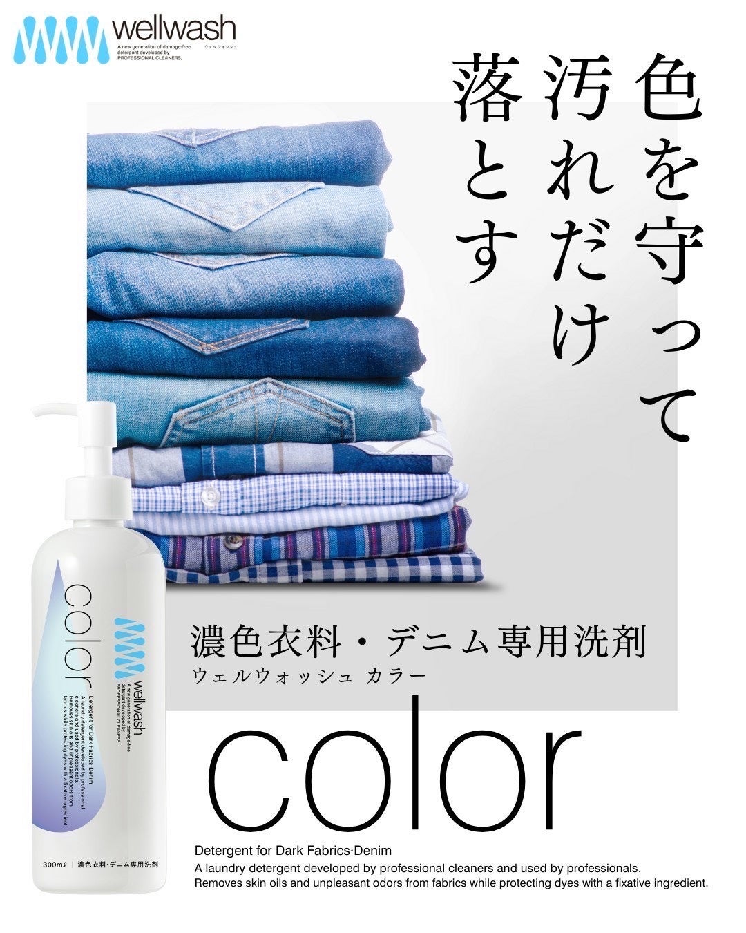 染料をコーティングしながら洗うことで、洗うたびに色と風合いを“育てる”という新発想の家庭洗いを実現しました。衣類にも環境にもやさしい処方で、プロのクリーニング現場でも採用されています。