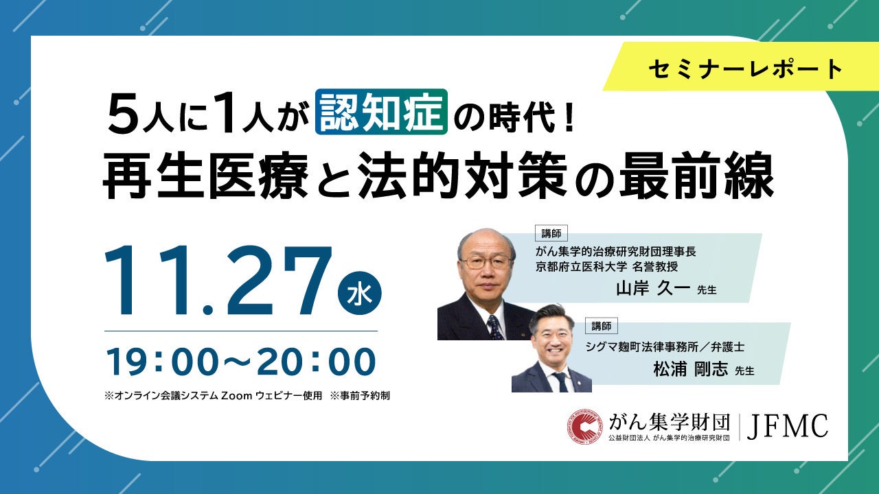 公益財団法人がん集学的治療研究財団(東京都江東区、会長:藤田 讓・理事長:山岸 久一)は、11月27日(水)に、WEBセミナー『5人に1人が認知症の時代!再生医療と法的対策の最前線』を開催しました。