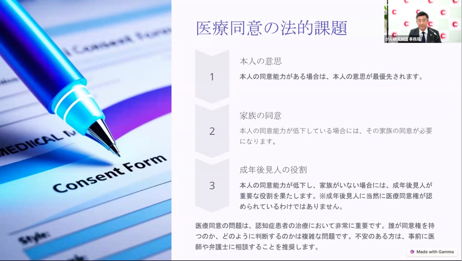 再生医療の治療を受ける際、認知症患者の同意能力が問題となる場合があります。軽度の患者であれば本人の意思が最優先されますが、同意能力に問題のある場合、法律上の決まりはありません。実務的には家族の同意が重要になります。成年後見人には医療同意に関する権限はありませんが、家族の意見が分かれる場合では重要な役割を果たすことになります。そして、今後はさらなる法的整備が必要とされていると聴講者に伝えました。