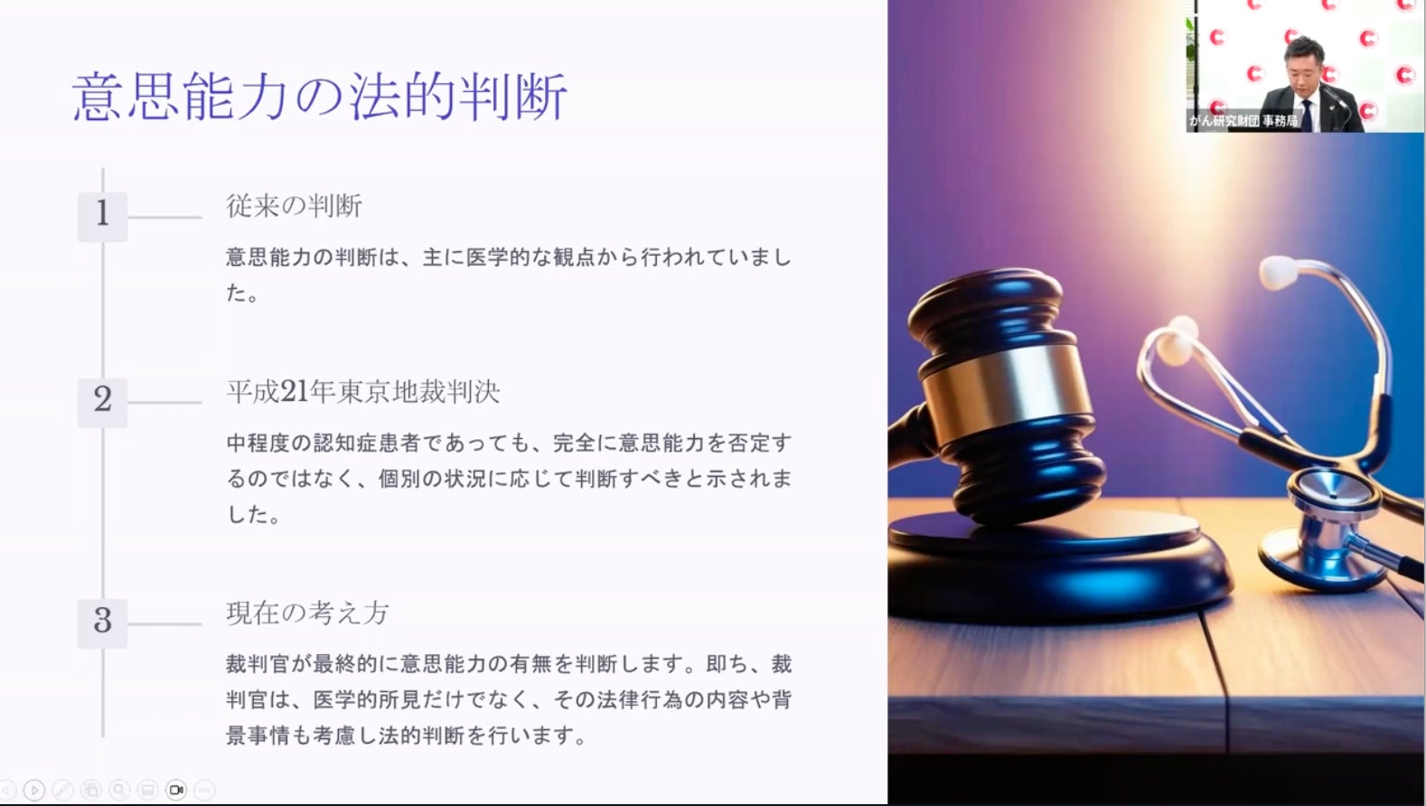 意思能力とは、自己の権利や義務についてしっかり判断できる能力であり、財産管理、契約、相続、遺言、事業の継続等の場面において重要な能力とされています。ただ、認知症患者においては意思能力が低下しており、上記の場面では係争が起こる可能性があります。松浦先生は、係争時に意思能力を判断するのは裁判官であり、医師の診断だけでなく、様々な情報を総合的に考慮して判断していると説明しました。また意思能力が認められた例、認められなかった例に分けて、具体的な係争内容と裁判官の判断のポイントについて解説しました。