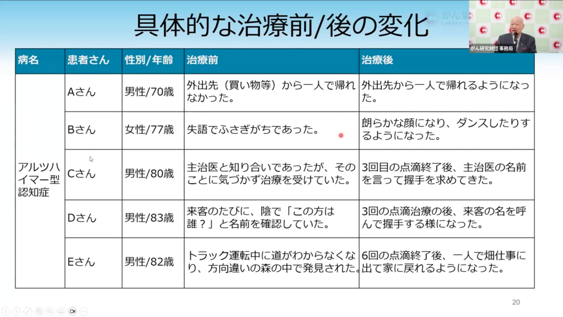 A3:中等度の認知症であれば、ADSCの投与で約75%の方が正常の基準近くに改善され、記憶障害も改善されています。私たちは日本で初めて、京都にて認知症のADSC治療を行いましたが、関東でも同様の治療を行っているところがあるかもしれません。厚生労働省に届けを出しているところはありますが、私たちと提携しているところではないため、詳細はわかりかねます。申し訳ございません。私たち、京都のなぎ辻病院でのADSC治療は、期間は約6か月、費用は1か月に1回投与で約170万円ほどになります。